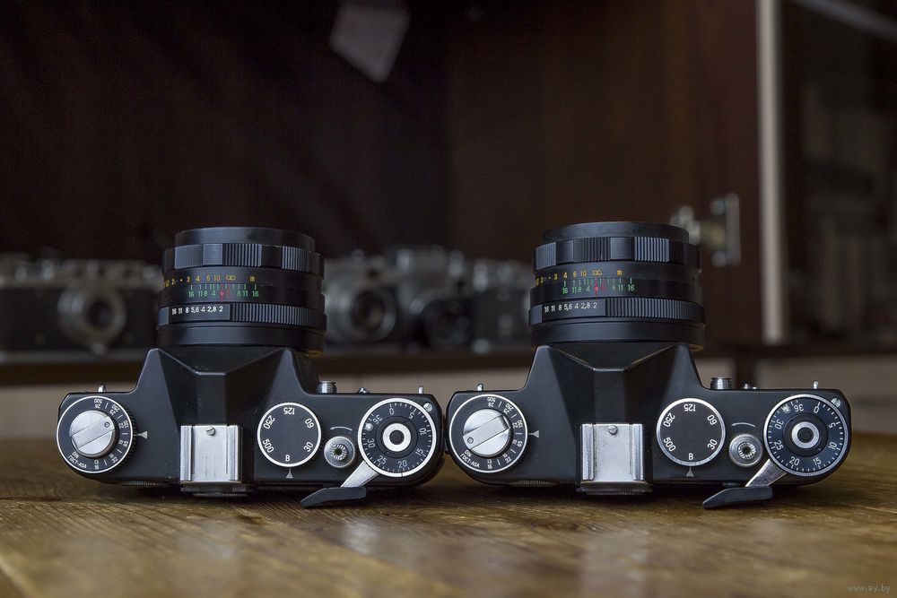 Зенит TTL N77019805 (на фото справа), написание названия на латинице, крышка батарейного отсека с прорезью.