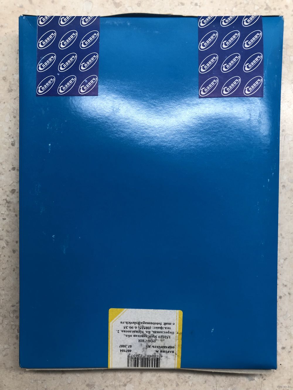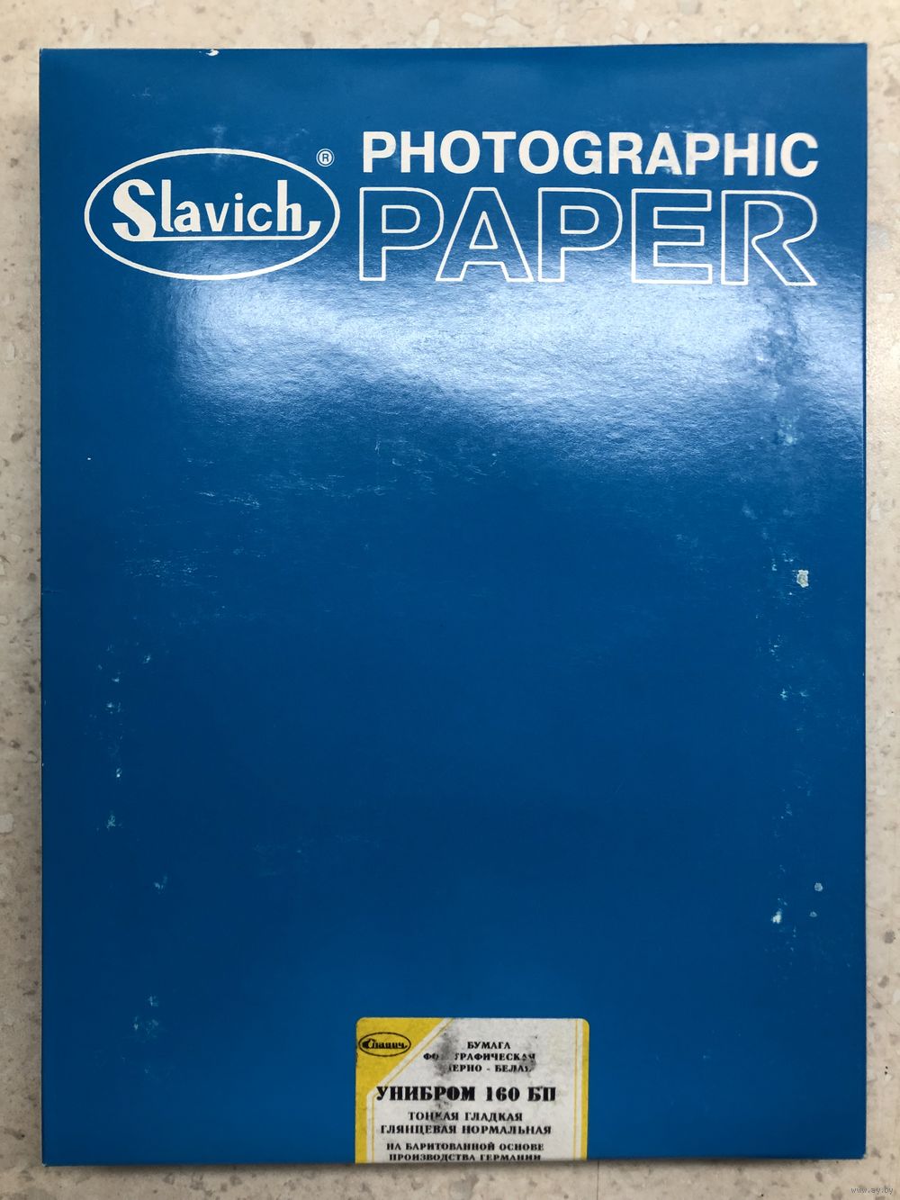 Переславское объединение "Славич", проверена - отличное техническое состояние, баритовая основа и эмульсия - производства Германии, радикально отличается от предыдущего советского производства глубоким чёрным тоном, толщина (заявленная "тонкой") скорее соответствует прежнему полукартону