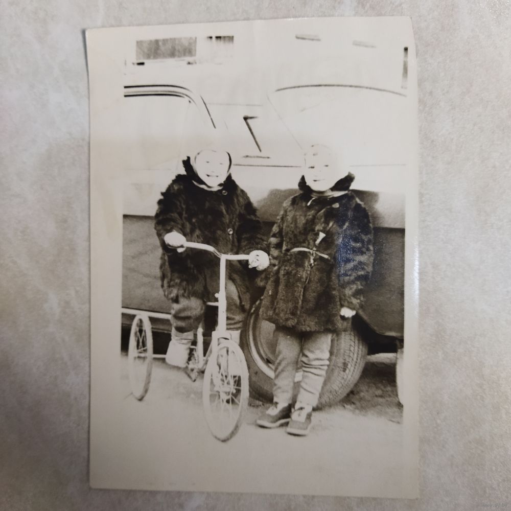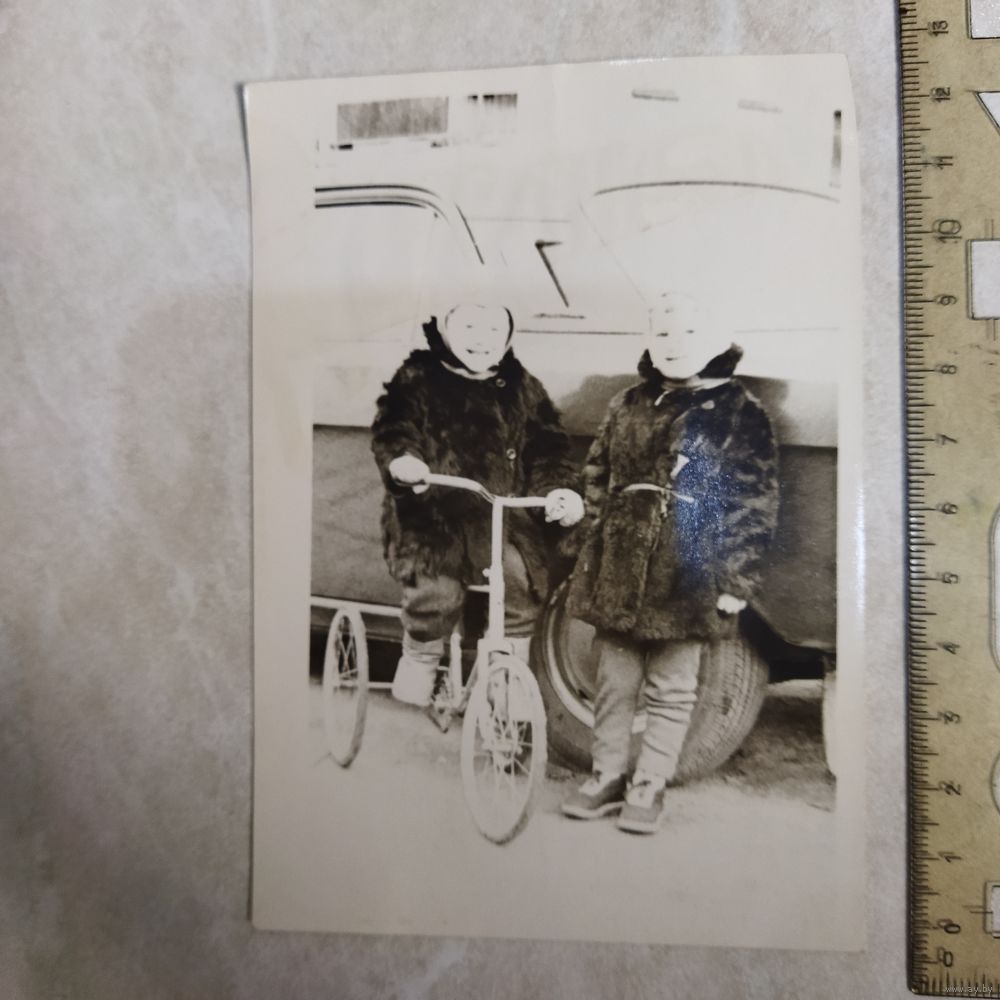 Фотография. История СССР в лицах. Дети на трёхколёсном велосипеде возле ГАЗ -24.