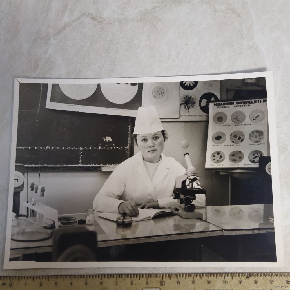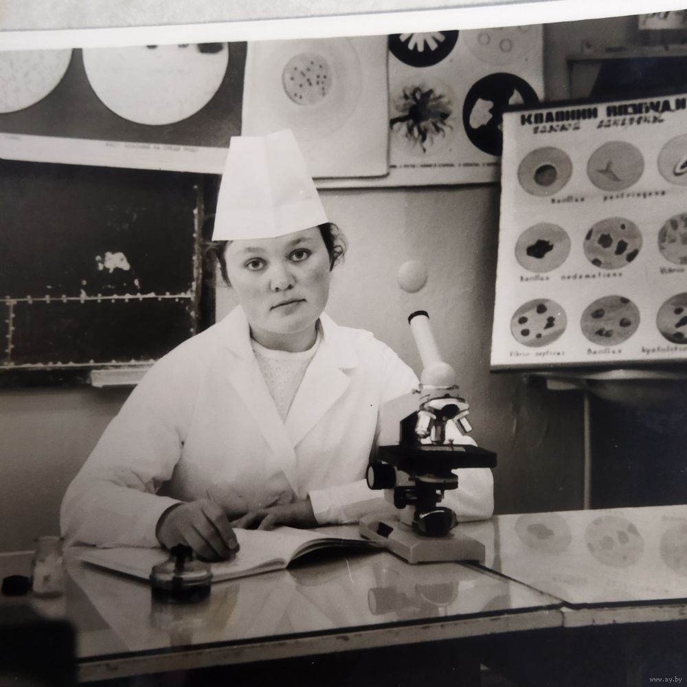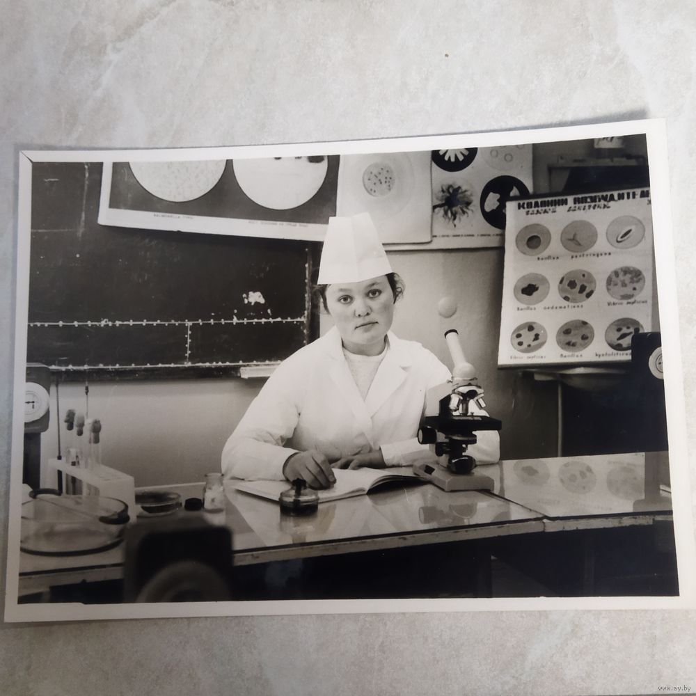 Фотография. История СССР в лицах. Девушка, студентка на кафедре микробиологии. Медицинский институт. Ретро СССР.
