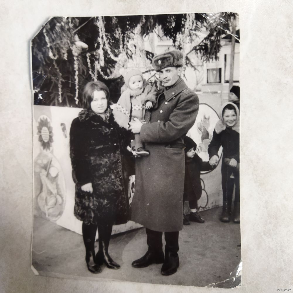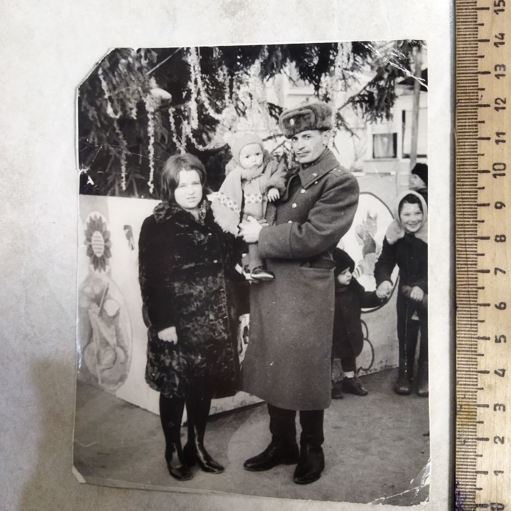 Фотография. История СССР в лицах. Прапорщик с семьёй у гарнизонной, новогодней ёлки. 1975 год..