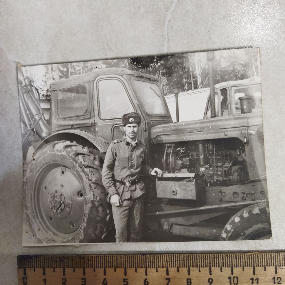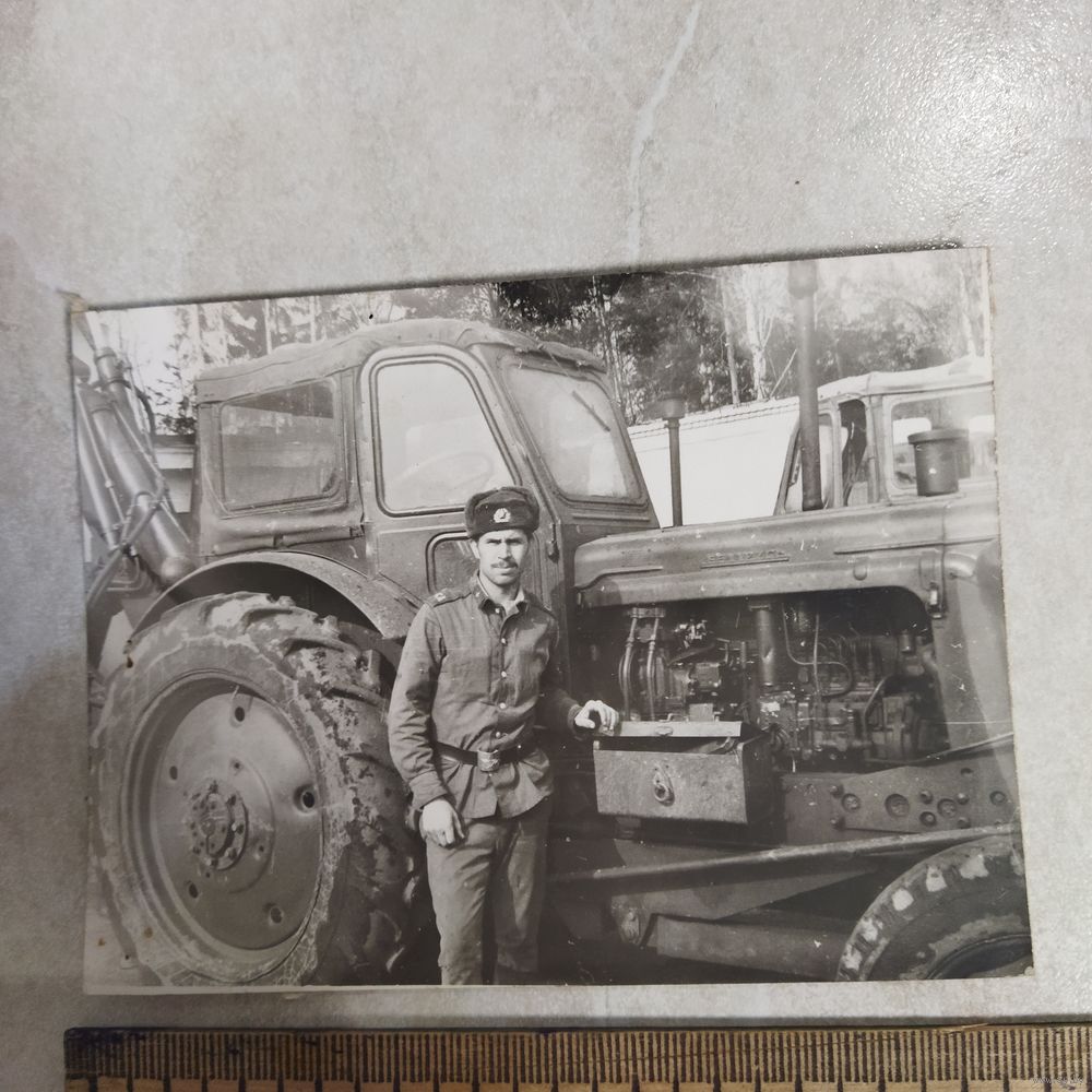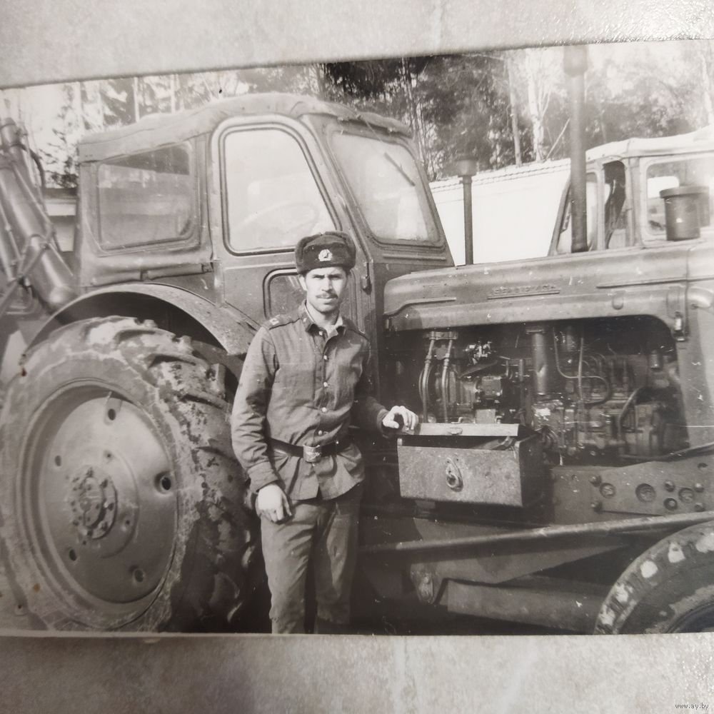 Фотография. История СССР в лицах. Солдат у трактора МТЗ -5. Советская армия.
