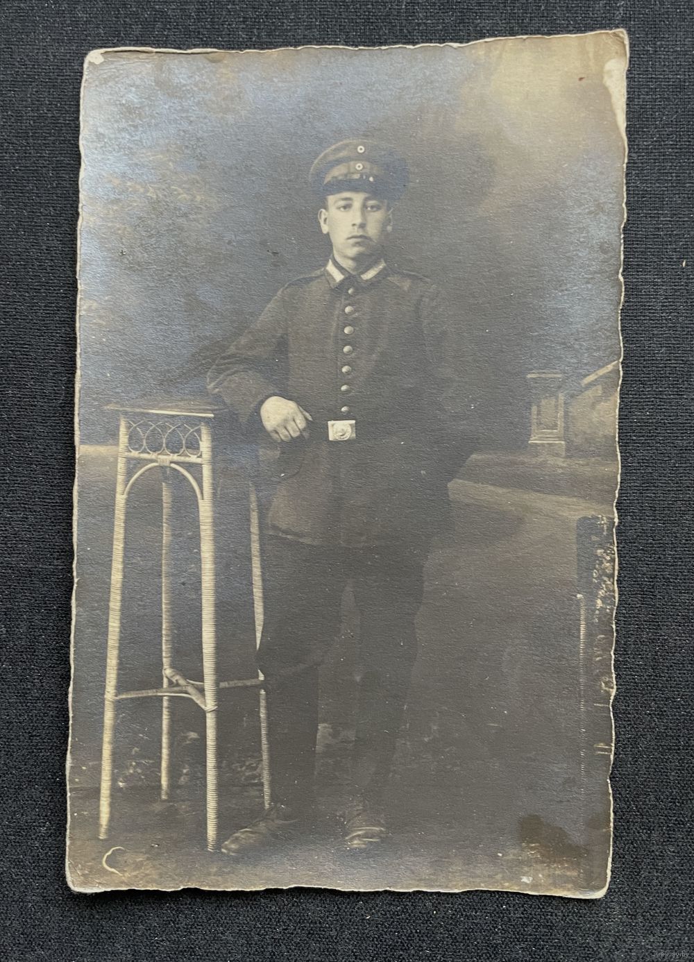 Фотооткрытка 1 Мировая война / Немецкий солдат / китель Feldbluse, фуражка Feldmutze, поясной ремень с пряжкой.