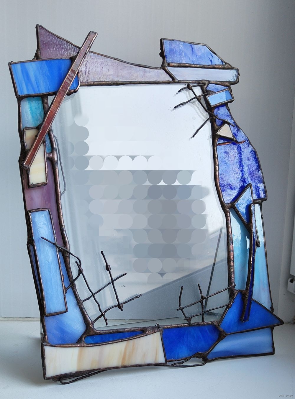 Сборка по классической технологии Тиффани (медная лента, оловянный припой, декоративная патина). Благодаря рельефу и глубоким цветам (синий, фиолетовый, молочный). Внутри находится авторская графика, которую вы можете оставить или легко заменить на свой снимок.