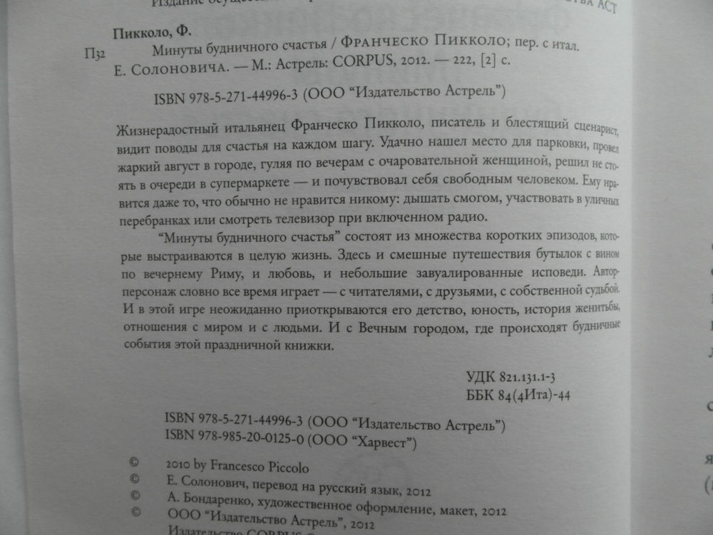 Франческо Пикколо - прозаик, романист, автор сценариев к двум десяткам фильмов и телесериалов, лауреат одной из самых престижных литературных наград - премии Стрега - и не менее престижной кинопремии Давид ди Донателло. После шумного успеха книги Минуты будничного счастья он продолжил работу в том же жанре веселой мозаики, избрав на сей раз своим объектом будничные несчастья, иначе говоря, все то, что в повседневной жизни может досаждать современному человеку. Забавные моменты невезения, воспоминания о любовных неудачах и остроумные наблюдения складываются в новый роман-коллаж о подлинных событиях из жизни автора. Обо всех своих несчастьях он повествует с юмором и итальянской жизнерадостностью. В 2019 году на экраны вышел фильм режиссера Д. Лукетти Минуты будничного счастья, основанный на сюжетах из обеих книг-близнецов.