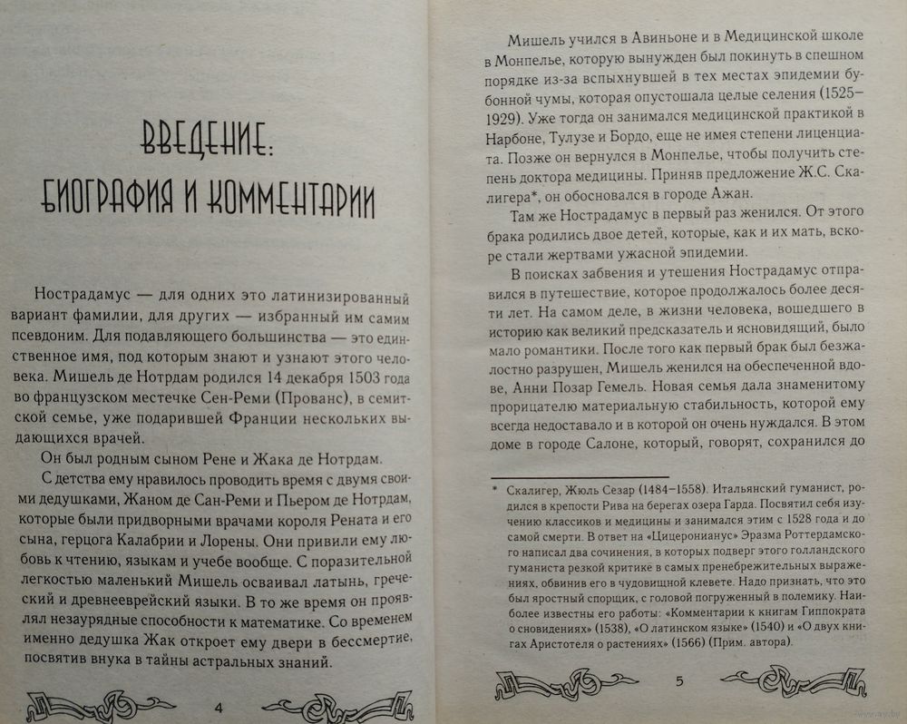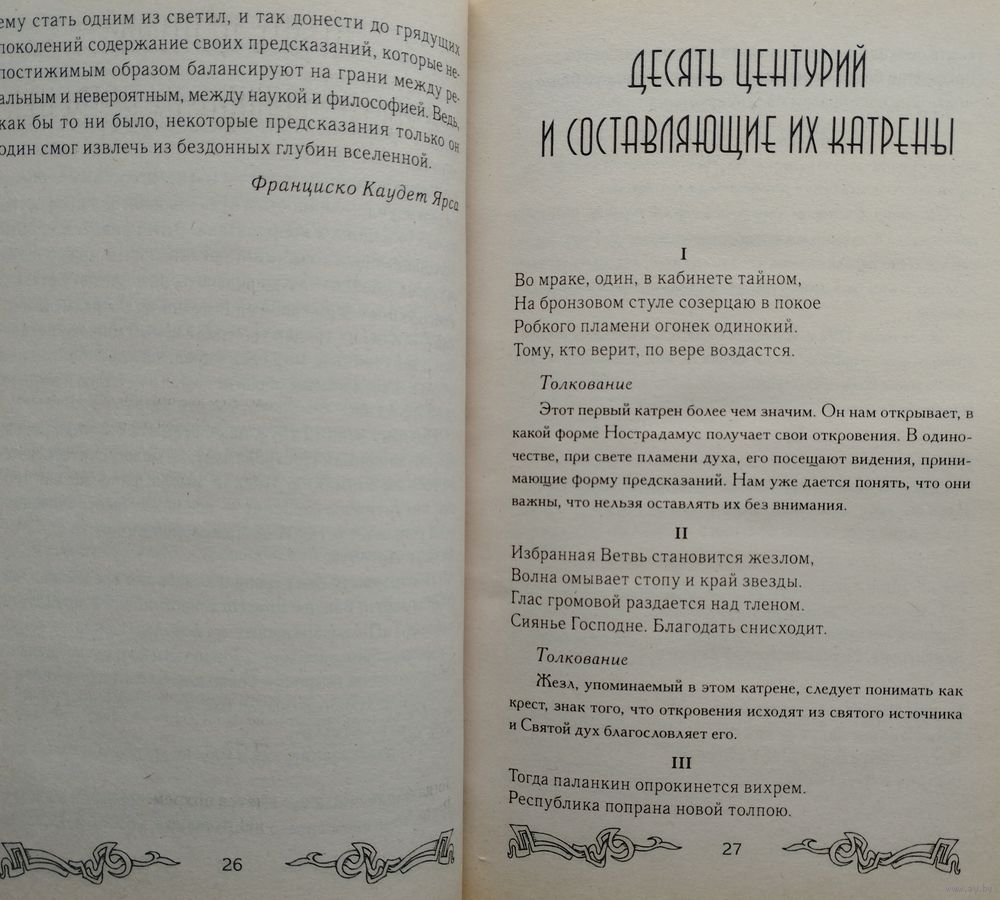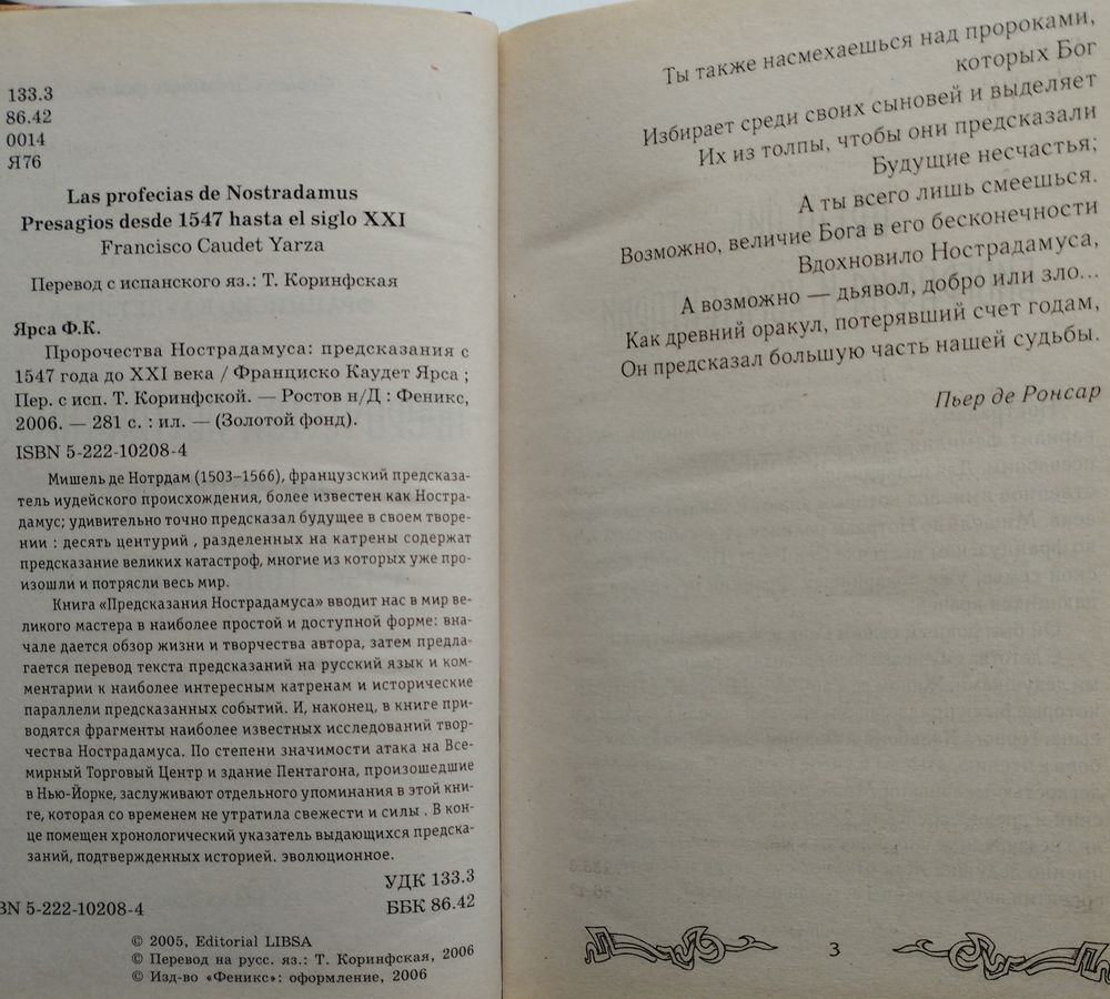 Тираж 3000 экз. 288 стр. Мишель де Нотрдам, французский предсказатель иудейского происхождения, более известен как Нострадамус; удивительно точно предсказал будущее в своем творении: десять центурий, разделенных на катрены содержат предсказание великих катастроф, многие из которых уже произошли и потрясли весь мир. Книга "Предсказания Нострадамуса" вводит нас в мир великого мастера в наиболее простой и доступной форме: вначале дается обзор жизни и творчества автора, затем предлагается перевод текста предсказаний на русский язык и комментарии к наиболее интересным катренам и исторические параллели предсказанных событий. И, наконец, в книге приводятся фрагменты наиболее известных исследований творчества Нострадамуса. По степени значимости атака на Всемирный Торговый Центр и здание Пентагона, произошедшие в Нью-Йорке, заслуживают отдельного упоминания в этой книге, которая со временем не утратила свежести и силы. В конце помещен хронологический указатель выдающихся предсказаний, подтвержденных историей.