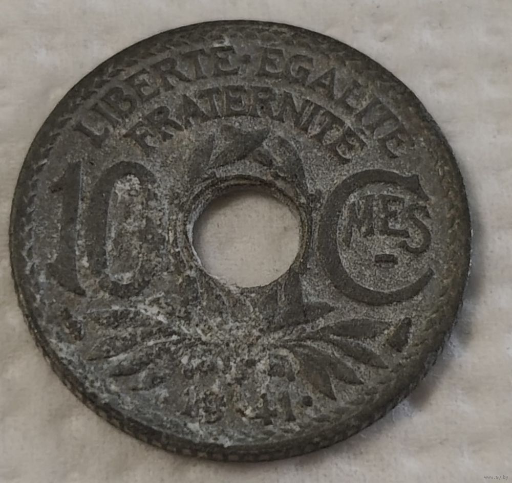 Франция 10 сантимов, 1941 Подчеркивание под MES, точки до и после 1941 (14-18-34)