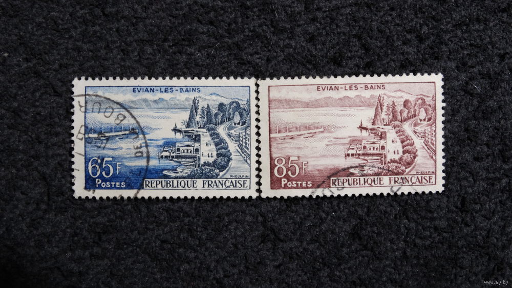 На изображении представлены две французские почтовые марки с изображением города Эвьян-ле-Бен (Évian-les-Bains).