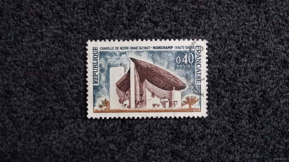 На изображении показана почтовая марка Франции с часовней Нотр-Дам-дю-О (Chapelle de Notre-Dame du Haut) в Роншане, Верхняя Сона.