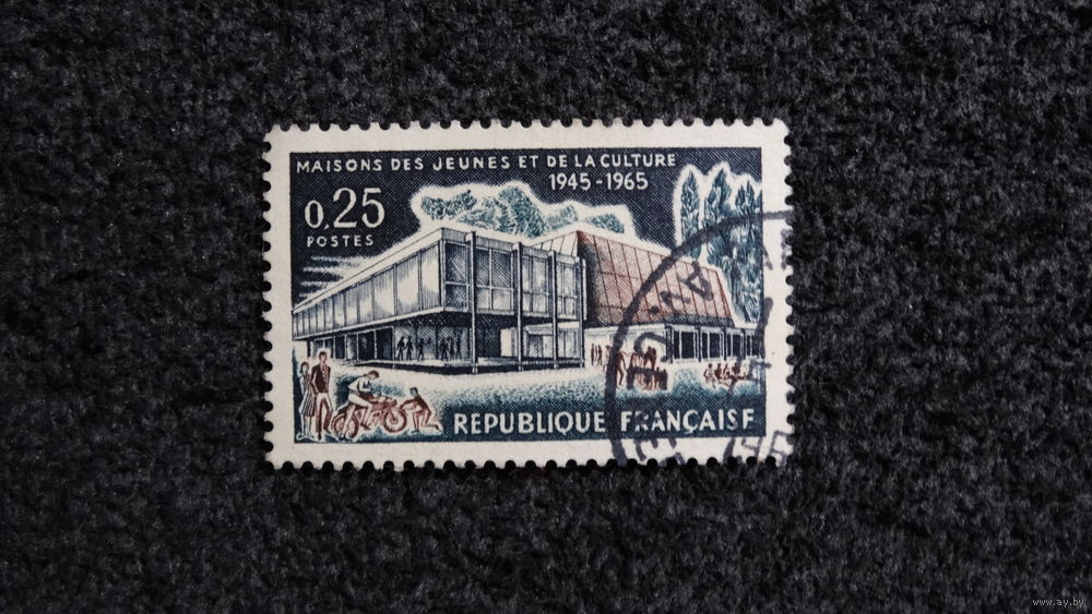 На изображении показана французская почтовая марка, выпущенная в 1965 году в честь 20-летия движения «Maisons des Jeunes et de la Culture» (MJC).