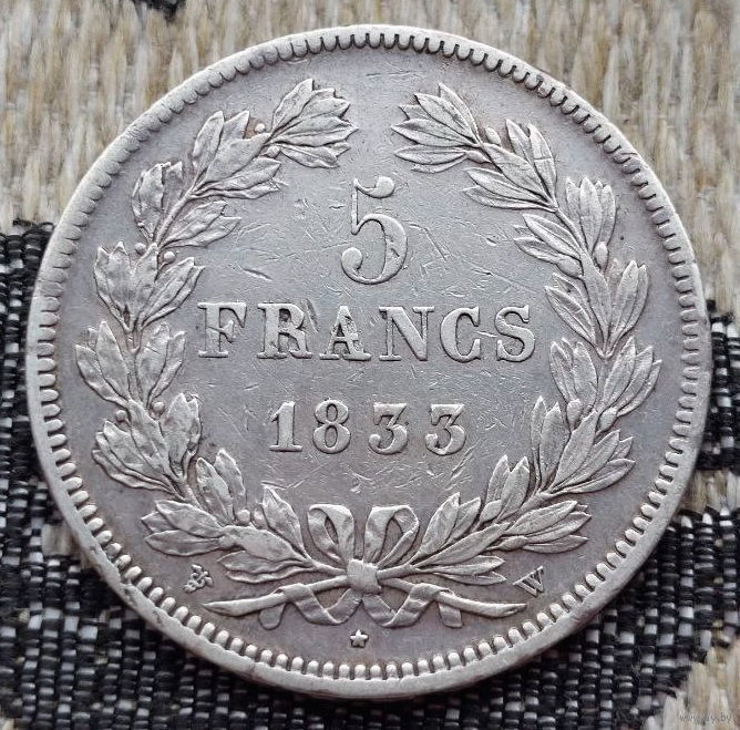Франция 5 франков 1833 года, W. Лилль. Луи Филипп I. Серебро 900. Сторгуй за свою цену, предложи обмен! S120