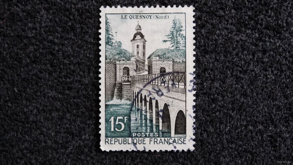 На изображении показана французская почтовая марка с надписью «LE QUESNOY (Nord)» и номиналом «15f». На марке изображен мост и башня с часами города Ле-Кенуа.