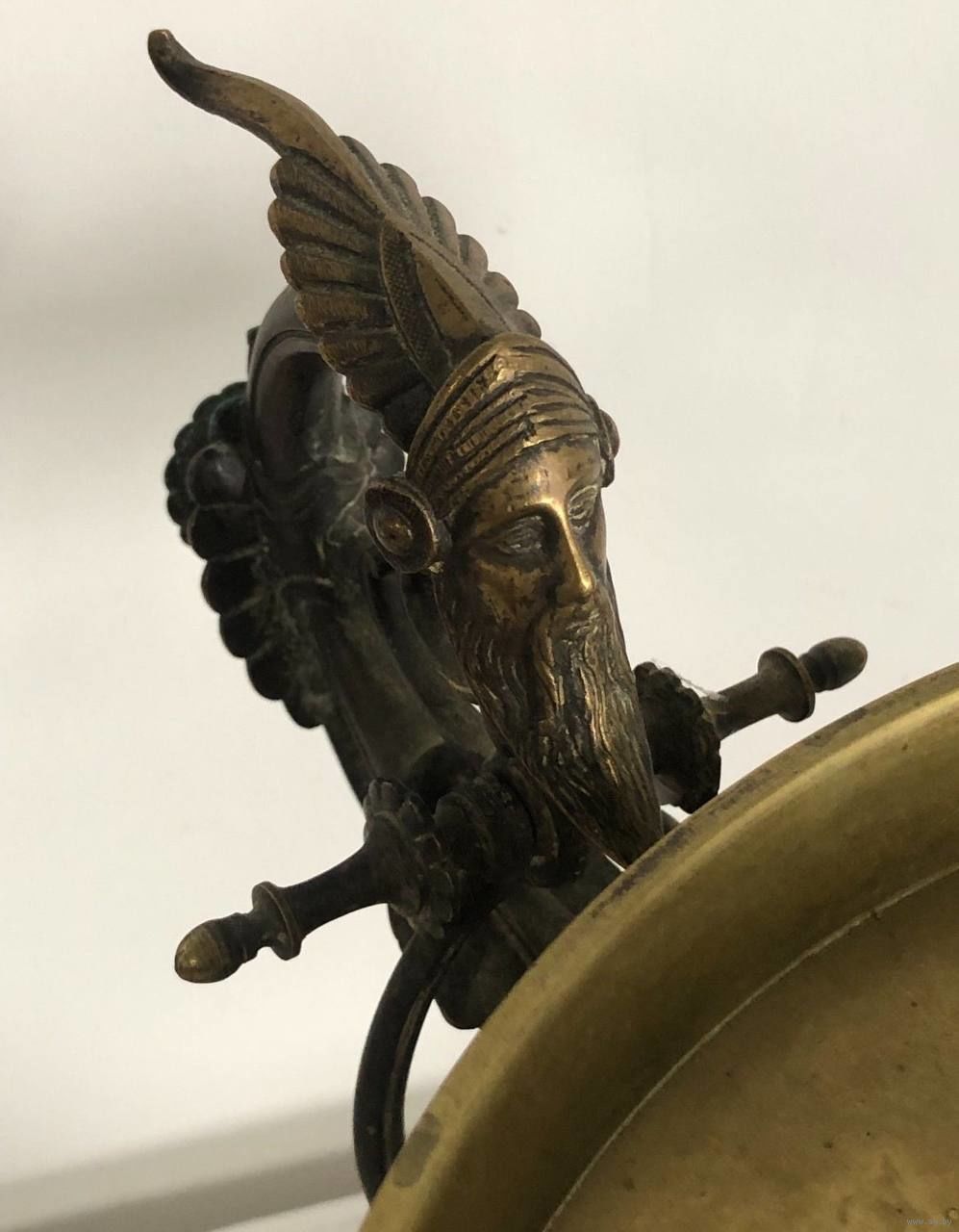 Чаша из бронзы и латуни с мифологическим декором в виде масок и завитков, основание из пальметта (высота 24 см, диаметр 25 см)