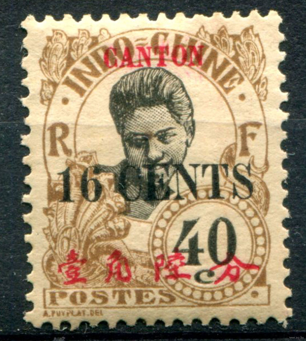 Французская индокитайская почта в Южном Китае - 1919г. - девушка, надпечатка CANTON (Гуанчжоу) 16 с на 40 с - 1 марка - чистая, без клея, есть маленькое пятнышко на лицевой стороне [Mi 77]. #4-W1-117-A-1