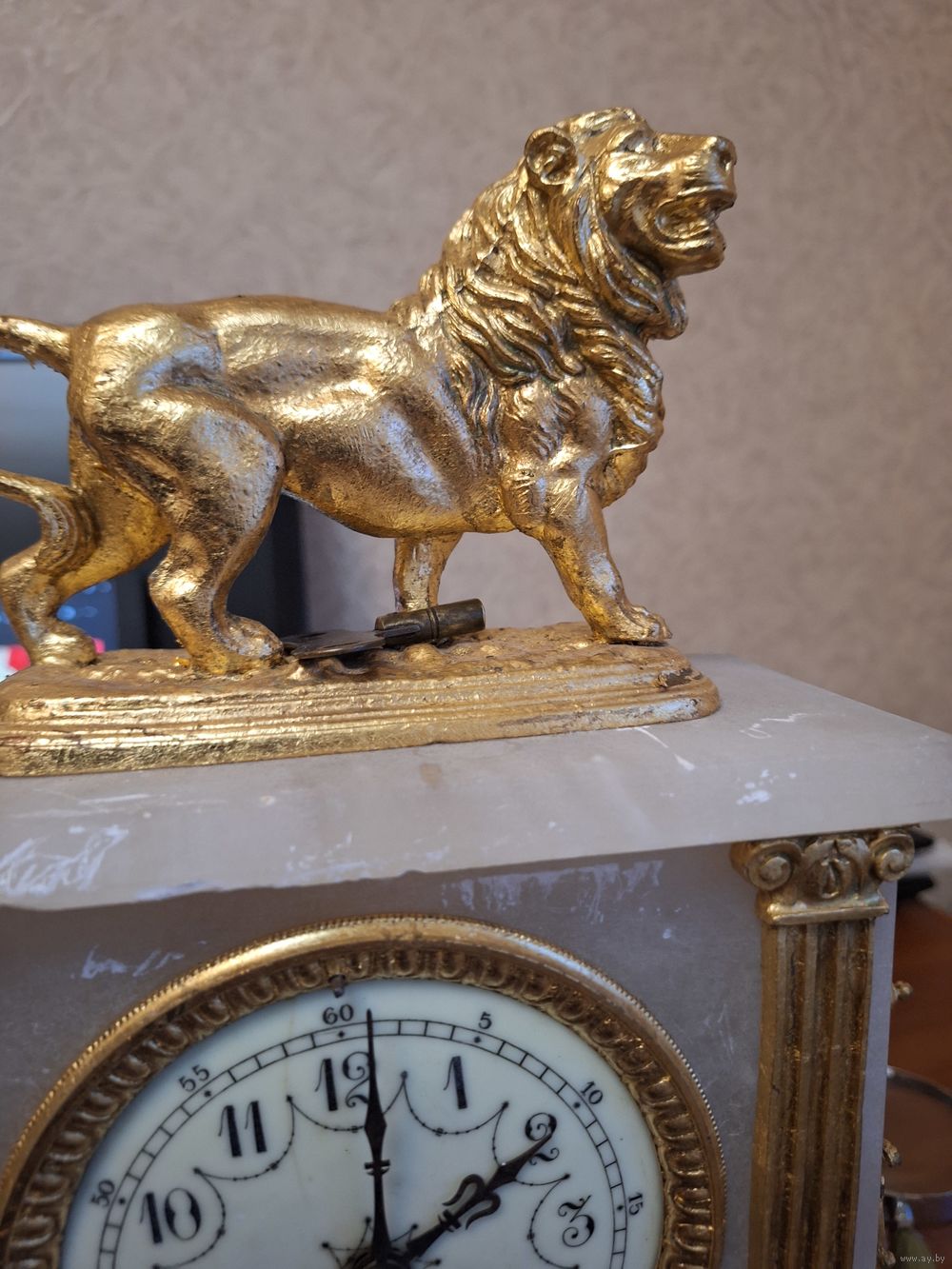 Каминные часы украшены рычащим львом в позолоте Часы механические с маятником и ключом