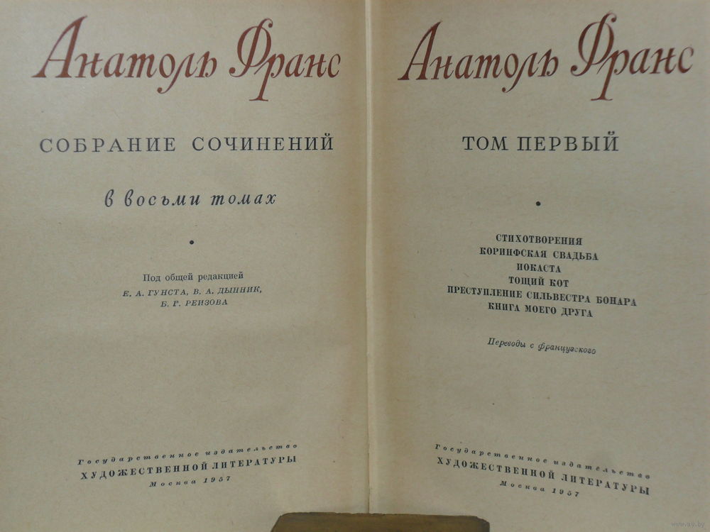 Содержание: Том 1 – Стихотворения. Коринфская свадьба. Иокаста. «Тощий кот». Преступление Сильвестра Бонара. Книга моего друга (Книга Пьера. Книга Сюзанны). Том 2 – Валтасар (Валтасар. Резеда господина кюре. Господин Пижоно. Дочь Лилит. Лета Ацилия. Красное яйцо. Пчелка). Таис. Харчевня королевы Гусиные Лапы. Суждения господина Жерома Куаньяра. Перламутровый ларец (Прокуратор Иудеи. Аминус и Целестин. Легенда о святых Оливерии и Либеретте. Святая Евфросиния. Схоластика. Жонглер богоматери. Обедня теней. Лесли Вуд. Гестас. Записки сельского врача. Записки волонтера. Рассвет. Госпожа де Люзи. Дарованная смерть. Эпизод из времен флореаля II года республики. Оловянный солдатик. Обыск). Том 3 – Красная лилия. Сад Эпикура. Колодезь святой Клары. Пьер Нозьер. Клио (Кимейский певец. Комм, вождь атребатов. Фарината дельи Уберти, или Гражданская война. Король пьет. «Мюирон»). Том 4 – Современная история: Под городскими вязами. Ивовый манекен. Аметистовый перстень. Господин Бержере в Париже. Том 5 – Театральная история. Кренкебиль, Пютуа, Рике и много других полезных рассказов (Кренкебиль. Пютуа. Рике. Мысли Рике. Галстук. Большие маневры в Монтиле. Эмиль. Адрианна Бюке. Гемма. Синьора Кьяра. Непокупные судьи. Христос океана. Жан Марто. Господин Тома. Домашняя кража. Эдме, или Удачно поданная милостыня). Пьесы (Чем черт не шутит. Кренкебиль. Ивовый манекен. Комедия о человеке, который женился на немой). На белом камне.