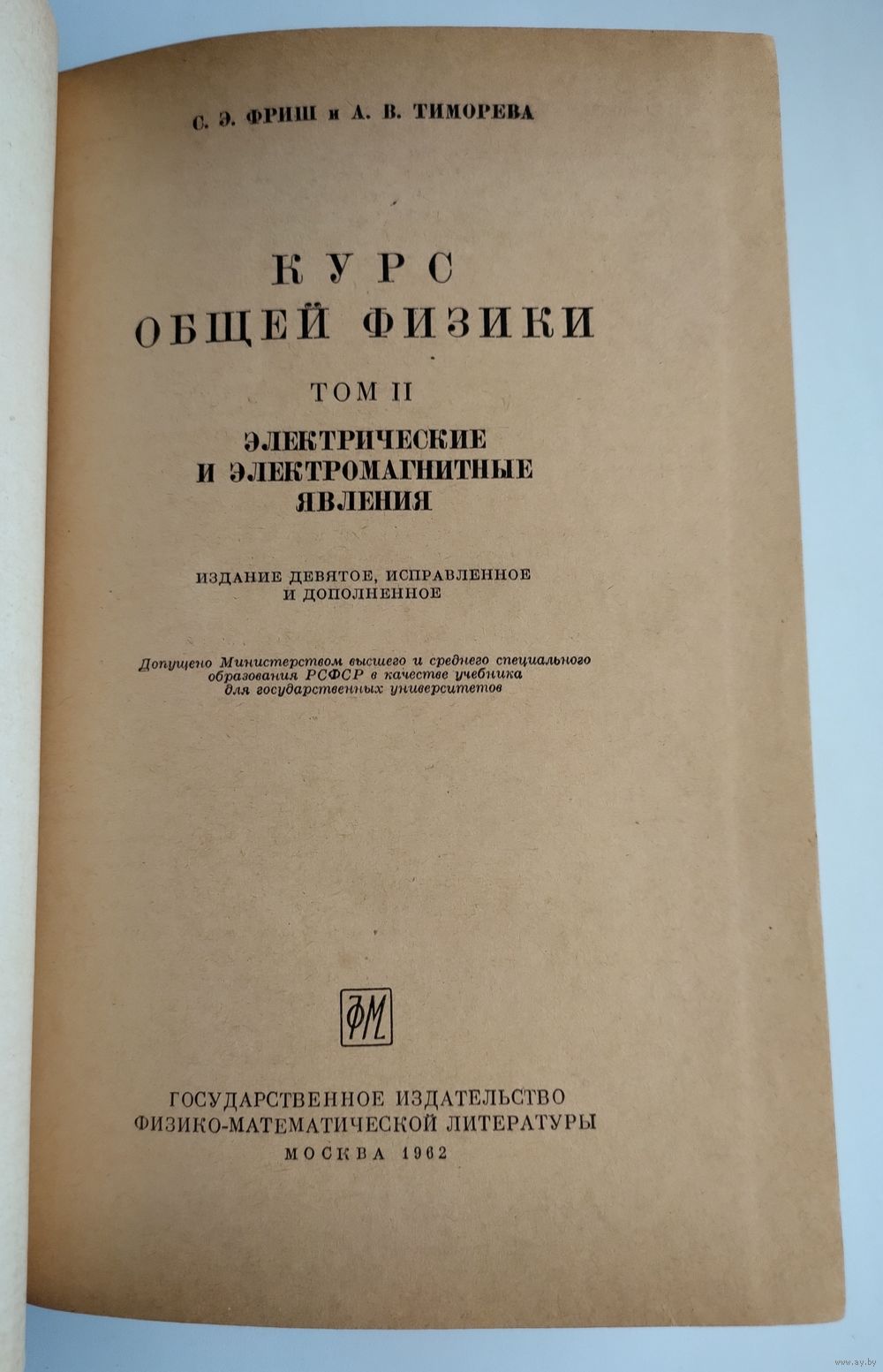 Фриш С.Э., Тиморева А.В. Курс общей физики. В 3-х томах. Том 2. Электрические и электромагнитные явления. Учебник для университетов. Издание девятое. М.: Физматлит, 1962г., 514с., ил. Твёрдый переплёт, чуть увеличенный формат.