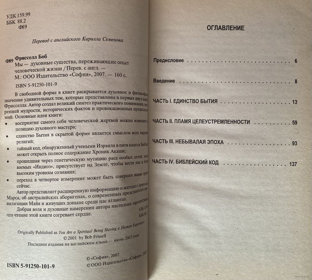 В свободной форме в книге раскрывается духовное и философское значение удивительных тем, которые представлены в первых двух книгах Фрисселла. Автор создал великий синтез практического понимания, внутренней мудрости, исторических фактов и провокационных предположений. Основные идеи книги: - восприятие самого себя человеческой жертвой можно изменить на позицию духовного мастера: - единство Бытия в скрытой форме является смыслом всех мировых религий: - тайный код, обнаруженный учеными Израиля в пяти книгах Библии, может открыть полное содержание Хроник Акаши: - прошедшая через генетическую мутацию раса особых детей, называемых `Индиго`, присутствует на Земле, чтобы вести нас к более высоким уровням сознания: - переход в четвертое измерение может быть совершен нами прямо сейчас. Автор представляет расширенную информацию о жителях Сириуса и Марса, об австралийских аборигенах, о современных представителях цивилизации Майя и живущих доныне среди нас атлантах. Добрая воля и духовные намерения автора настолько заразительны, что чтение этой книги согревает сердце
