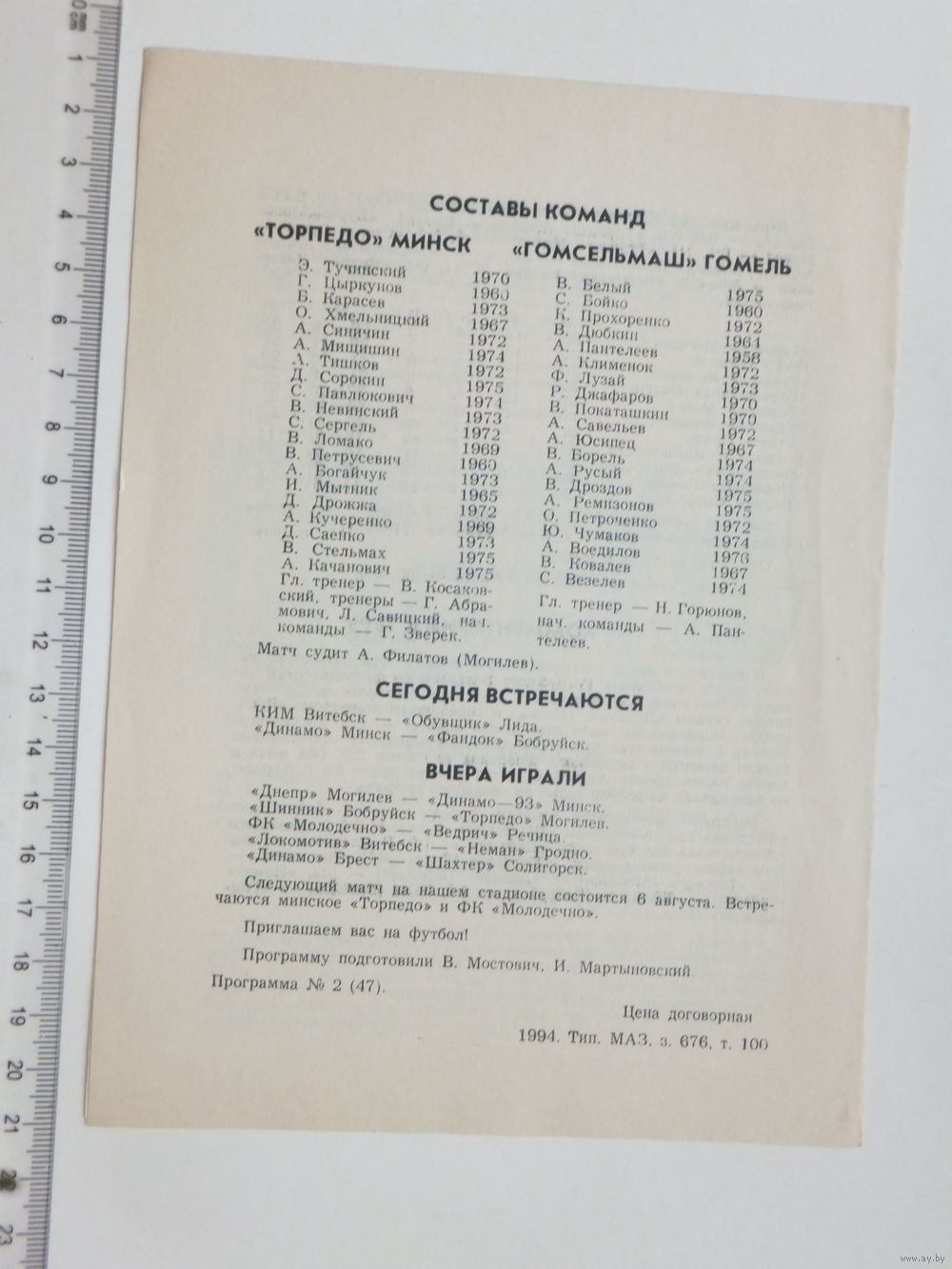Футбол Торпедо Минск Гомсельмаш Гомель 1994 г
