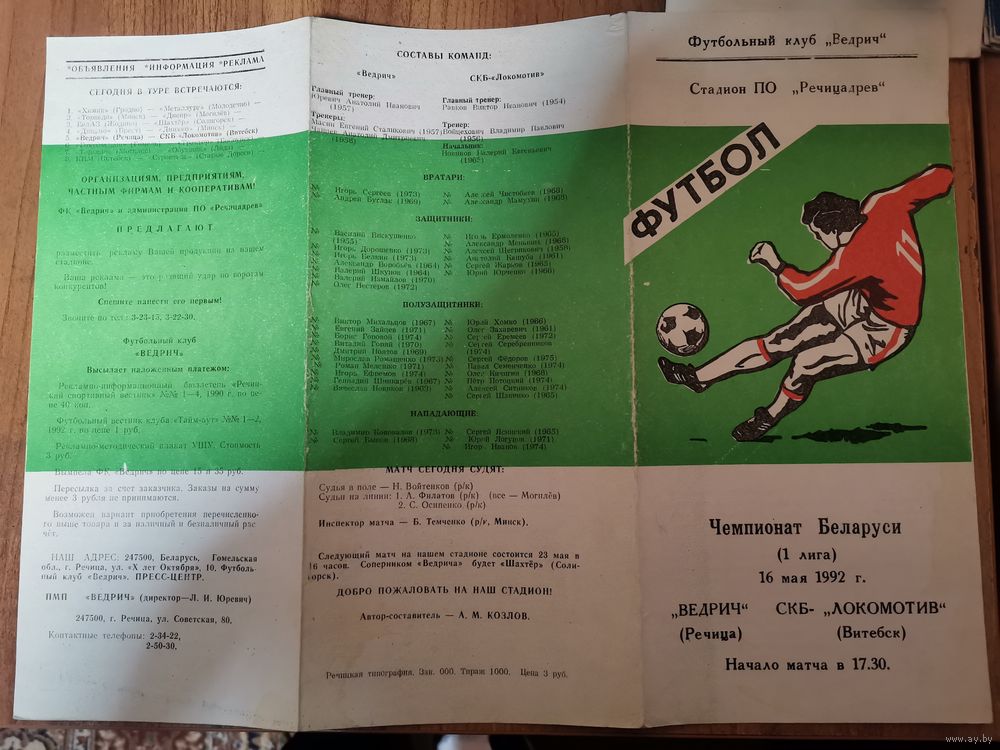 Футбольная программа.1 ч-т. Ведрич- СКБ-Локомотив Витебск .16,05,92г. Автор А.М.Козлов.