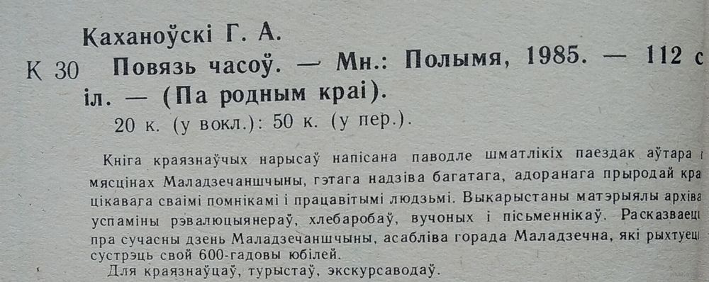 Г. А. Каханоўскі. Повязь часоў. Серыя: Па родным краі. Мінск : Полымя, 1985 г. 110 с. Мяккая вокладка.