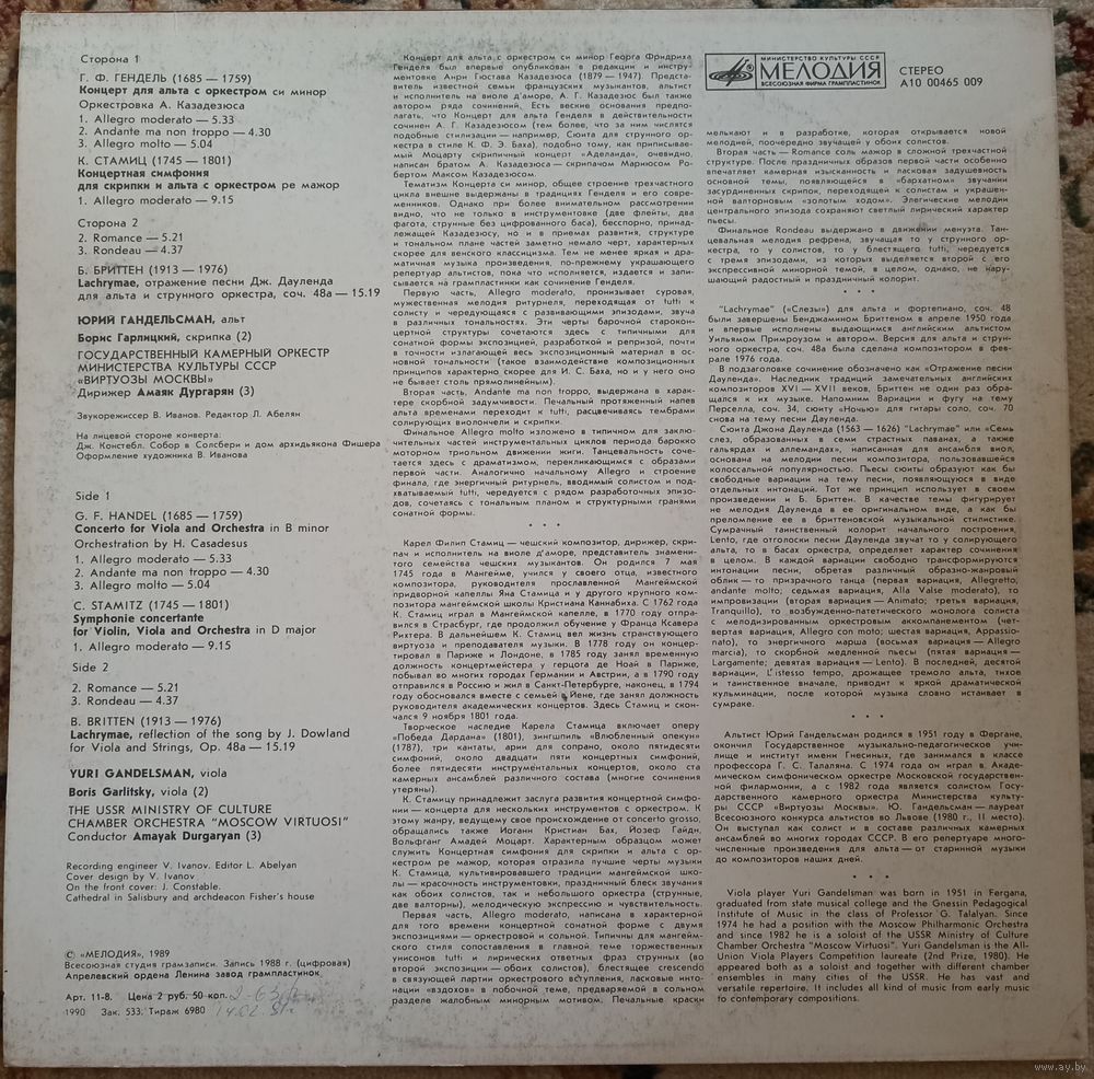 Г.Ф.Гендель / К.Стамиц / Б.Бриттен - Концерт Для Альта С Оркестром / Концертная Симфония Для Скрипки И Альта С Оркестром / Lachrymae.