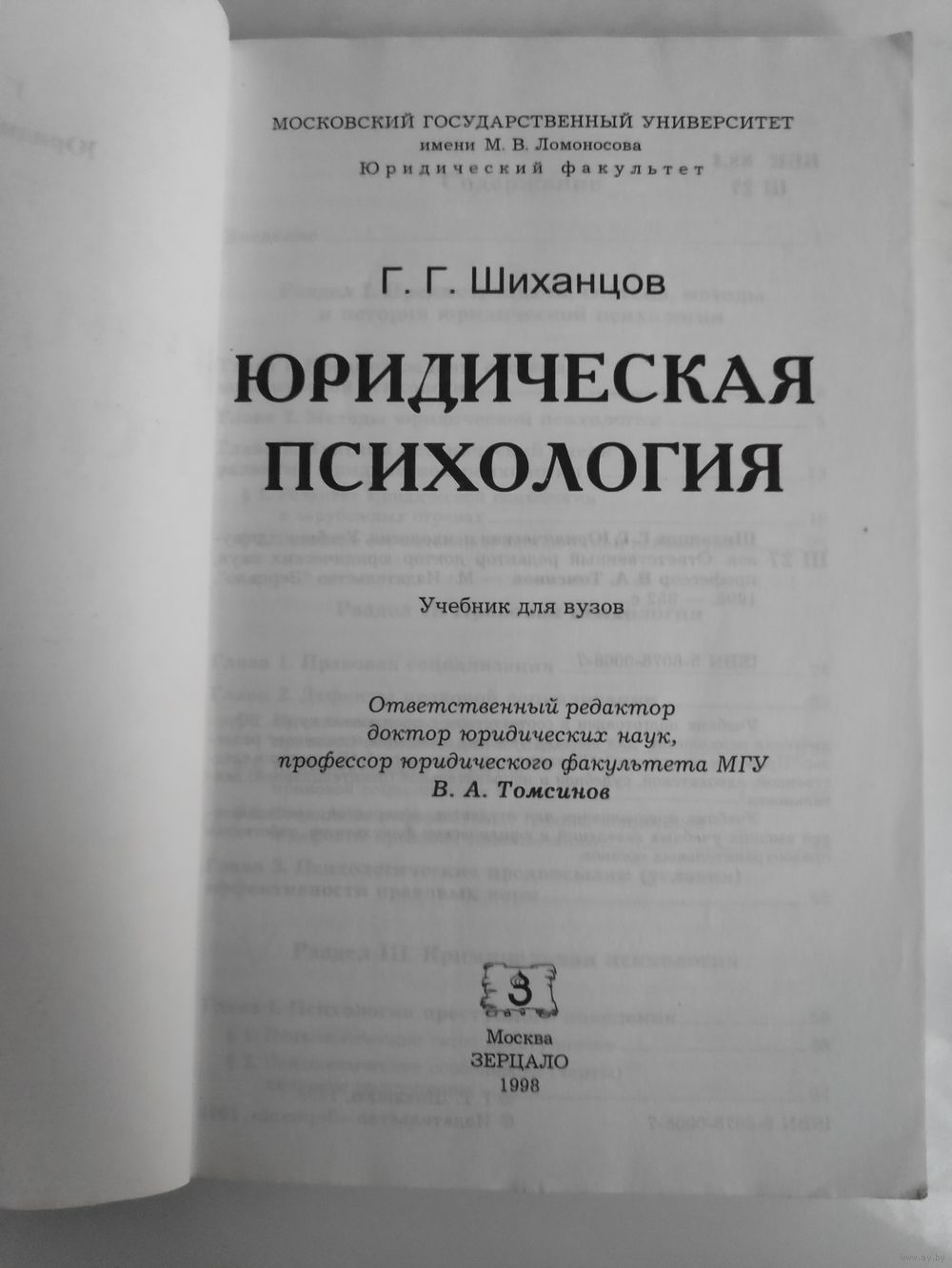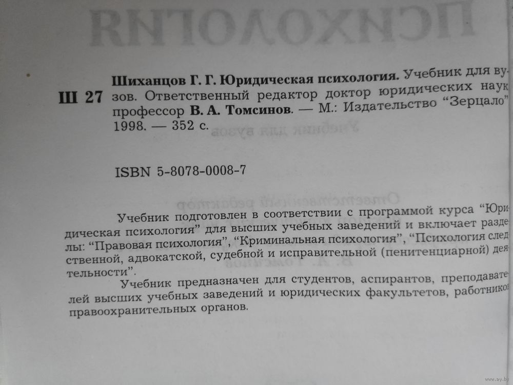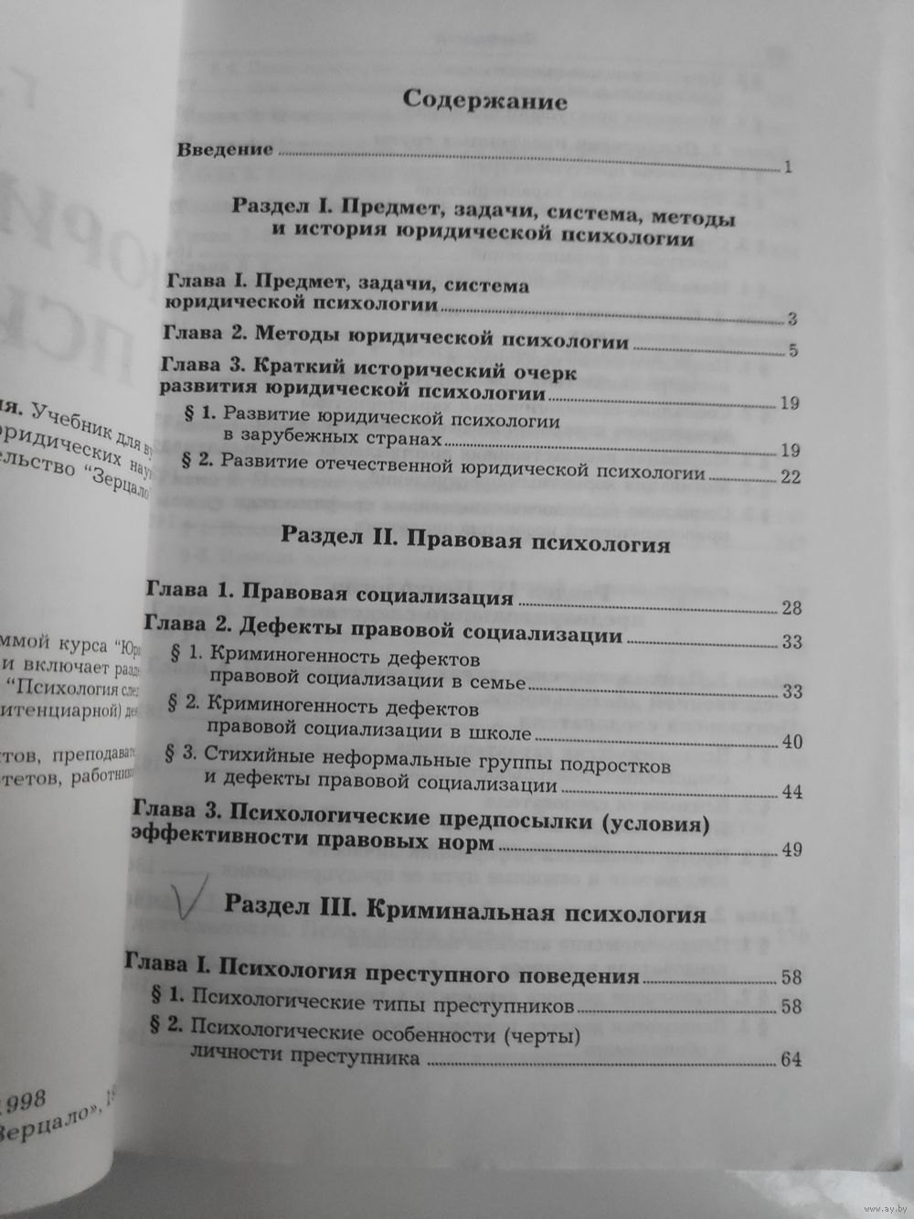 Учебник подготовлен в соответствии с программой курса `Юридическая психология` для высших учебных заведений и включает разделы: `Правовая психология`, `Криминальная психология`, `Психология следственной, адвокатской, судебной и исправительной (пенитенциарной) деятельности`.