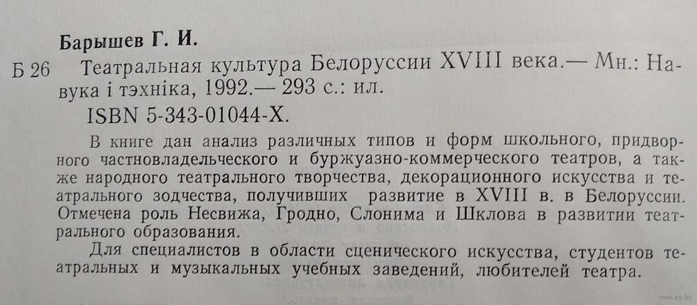 Г. И. Барышев. Театральная культура Белоруссии XVIII века. Минск : Навука і тэхніка. 1992 г. 290 с. Твердый переплет. Суперобложка.