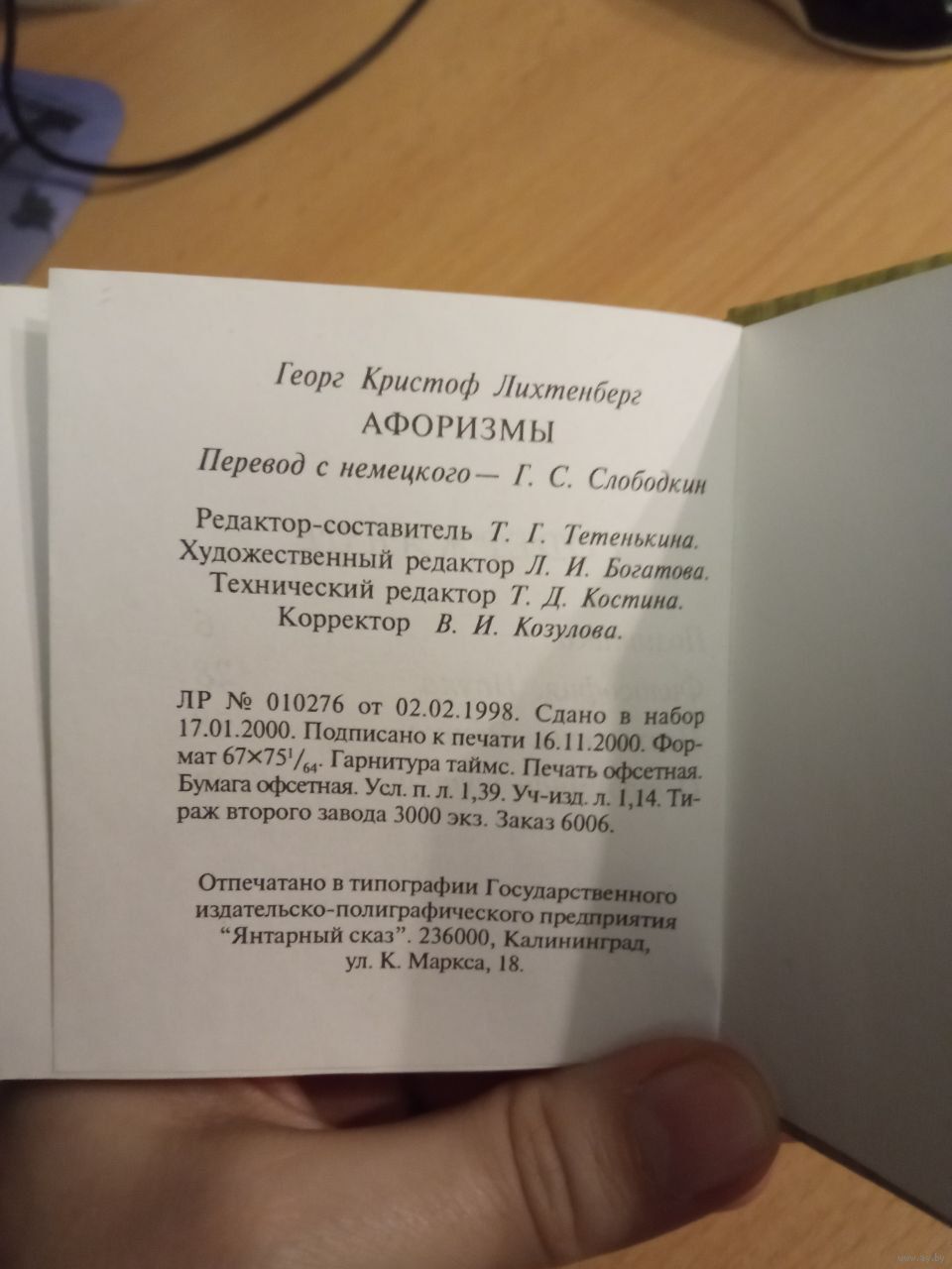 Книжка-малышка с афоризмами Георга Кристофа Лихтенберга. 8*8 см. 3000 экз., ГИПП «Янтарный сказ» г.Калининград, 2000.