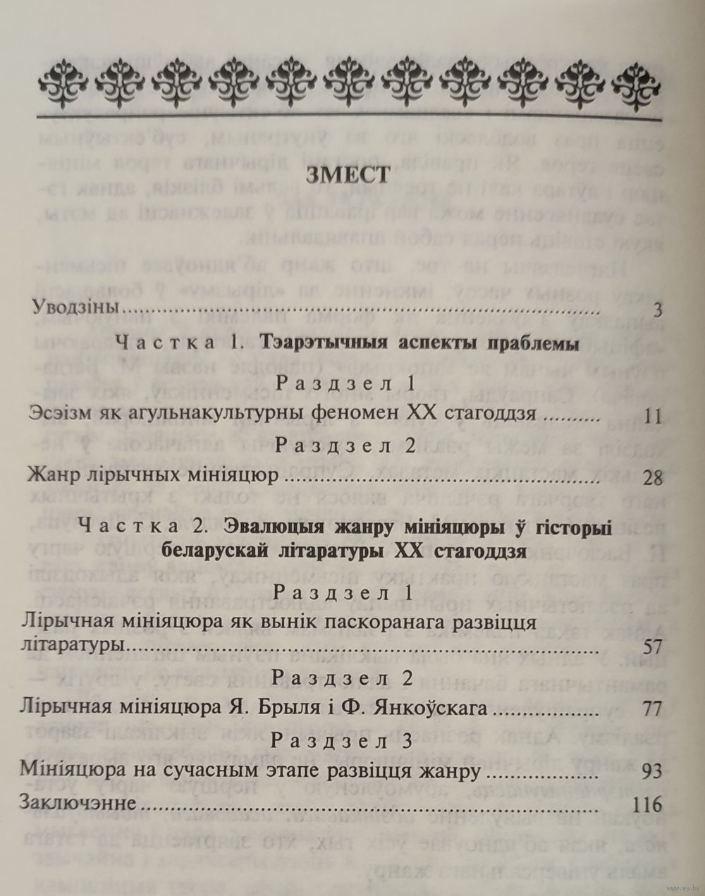 У аснову працы легла меркаванне, што базісным у лірьічнай мініяцюры з'яўляецца спецыфічны тып мастацкага мыслення, які характарызуецца рознымі даследчыкамі як лірыка-рамантычны, лірыка-філасофскі альбо эсэістычны. Праца складаецца з дзвюх частак. У першай даюцца тэарэтычныя звесткі аб гісторыі і своеасаблівасцях жанру. Другую складаюць тры раздзелы, дзе паслядоўна разгледжана развіццё беларускай мініяцюры на працягу XX стагоддзя.