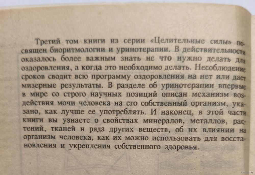 Третий том книги посвящен биоритмологии и уринотерапии. В действительности оказалось более важным знать не то что нужно делать для оздоровления, а когда это необходимо делать. Несоблюдение сроков сводит всю программу оздоровления на нет или дает мизерные результаты. В разделе об уринотерапии впервые в мире со строго научных позиций описан механизм воздействия мочи человека на его собственный организм, указано, как лучше ее употребить. И, наконец, в этой части книги вы узнаете о свойствах минералов, металлов, растений, тканей и ряда других веществ, об их влиянии на организм человека, как их можно использовать для восстановления и укрепления собственного здоровья.
