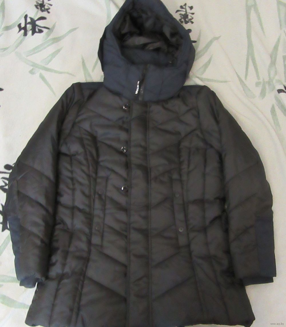 Пуховик, черно-синяя куртка приталенная с козырьком на капюшоне.