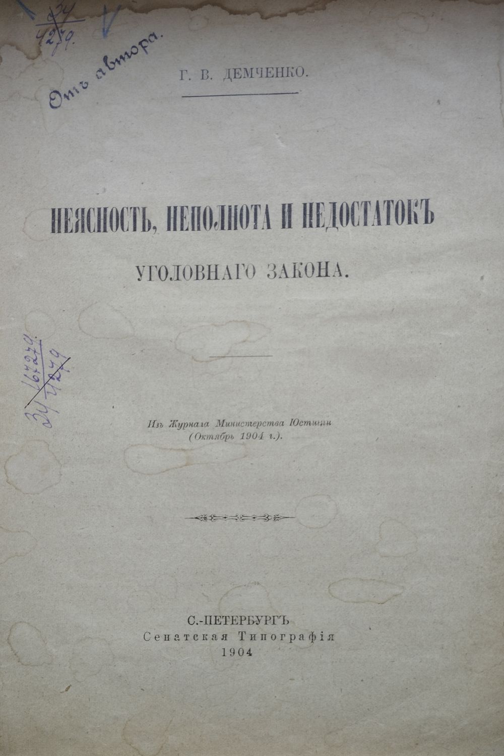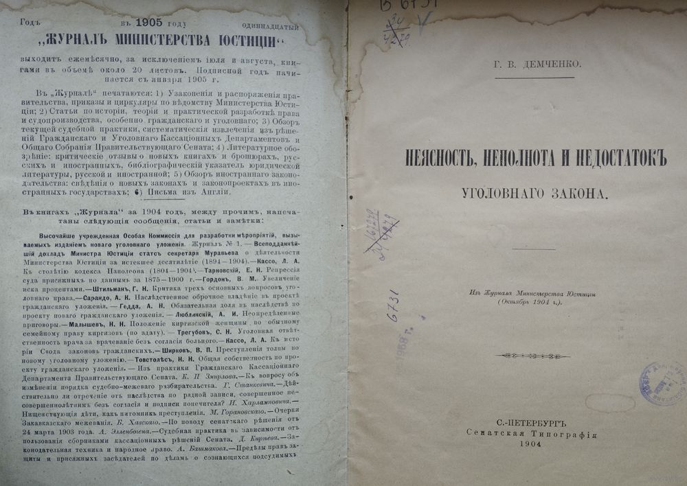 Большой энциклопедический формат. Прижизненное издание с автографом. «Неясность, неполнота и недостаток уголовного закона» — известная научная работа юриста и правоведа, профессора кафедры уголовного права и судопроизводства Григория Кондратьевича Демченко, опубликованная в 1904 году в Сенатской типографии в Санкт-Петербурге. Работа посвящена анализу проблем толкования и применения уголовно-правовых норм в условиях их несовершенства во время Русско-Японской войны. Основные идеи исследования включают: