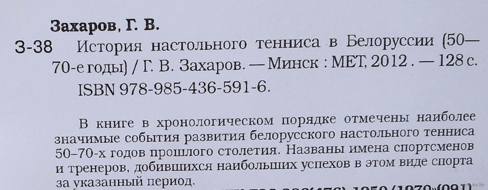 Г. В. Захаров. История настольного тенниса в Белоруссии (50-70-е годы). Минск.МЕТ, 2012 г. 125 с. Мягкая обложка.
