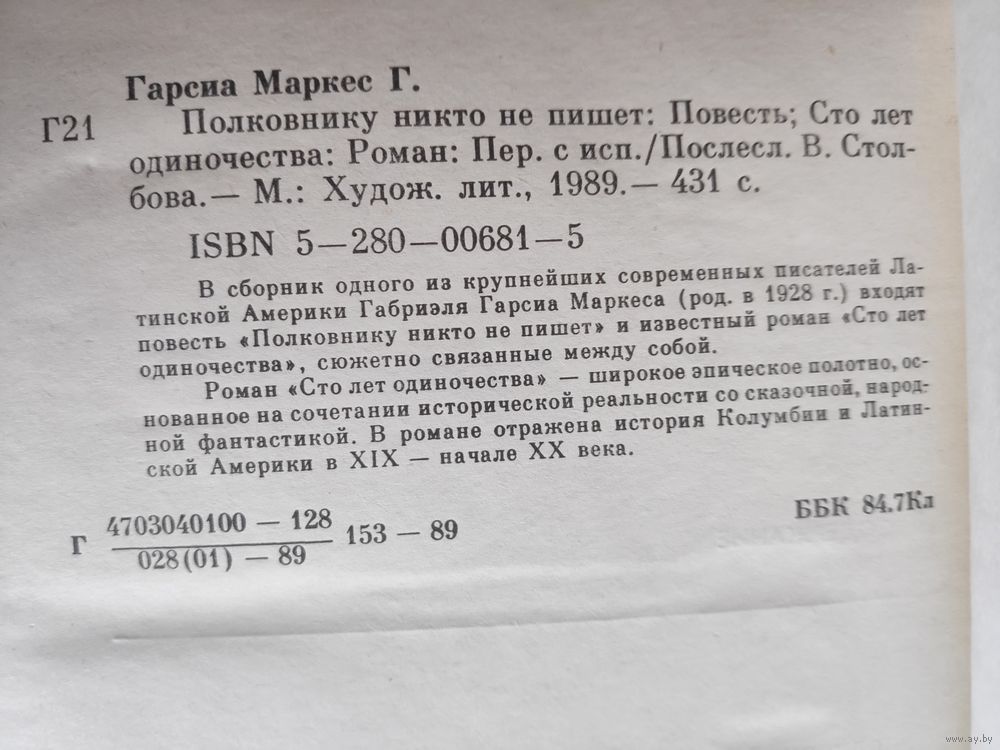 В сборник одного из крупнейших современных писателей Латинской Америки Габриэля Гарсиа Маркеса (род. в 1928 г.) входят повесть «Полковнику никто не пишет» и известный роман «Сто лет одиночества», сюжетно связанные между собой.Роман «Сто лет одиночества» - широкое эпическое полотно, основанное на сочетании исторической реальности со сказочной, народной фантастикой. В романе отражена история Колумбии и Латинской Америки в XIX - начале XX века.