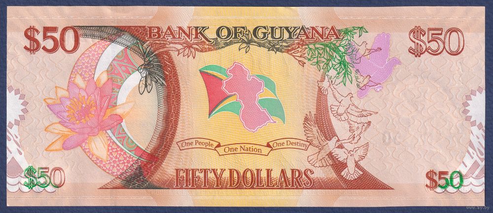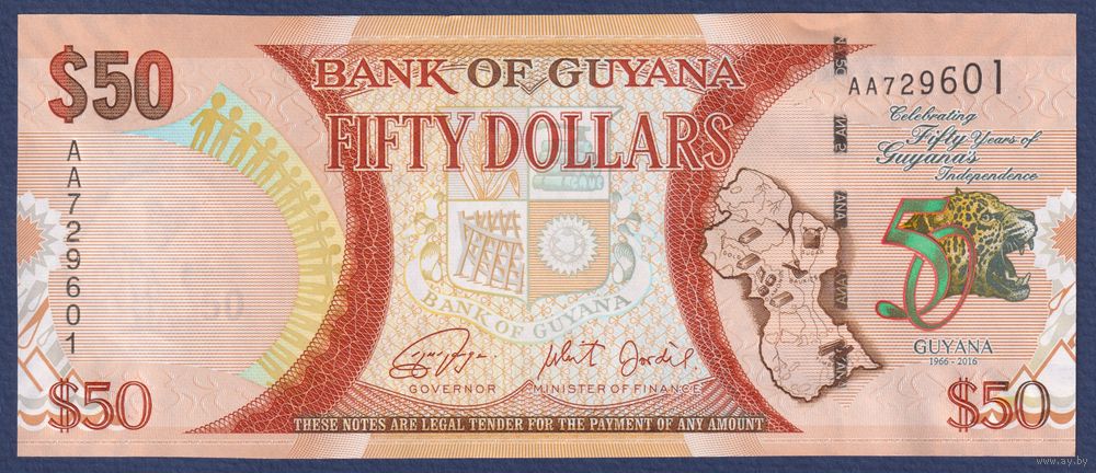 Гайана, 50 долларов 2016 г, P-41 (памятная - 50 лет независимости, серия АА), UNC
