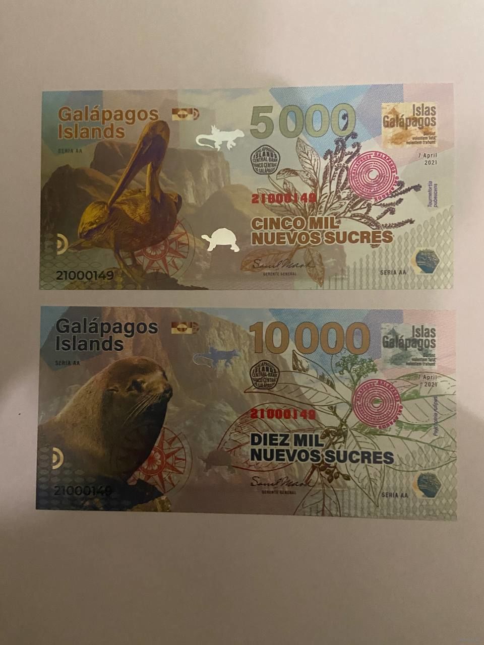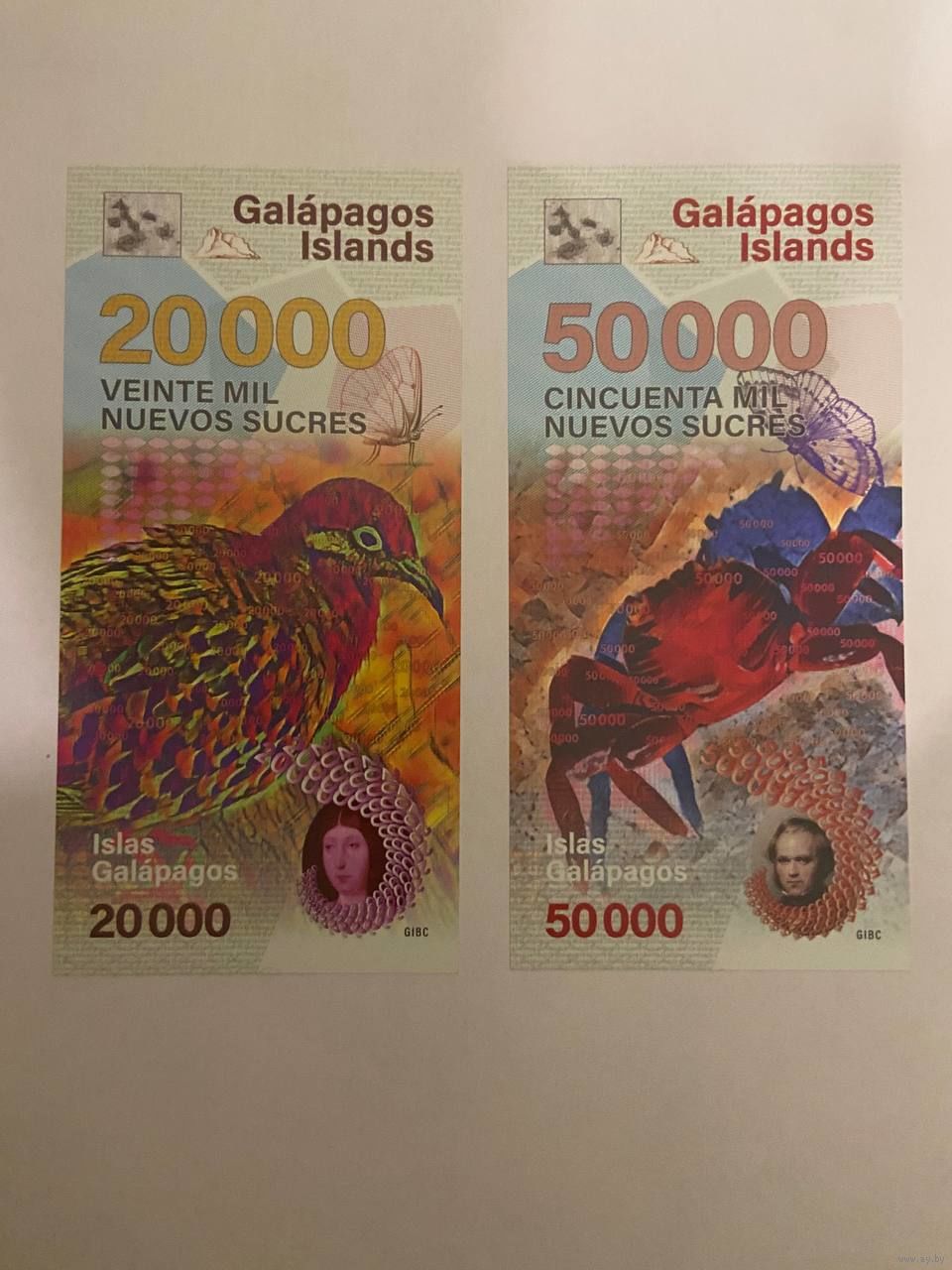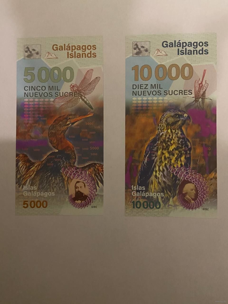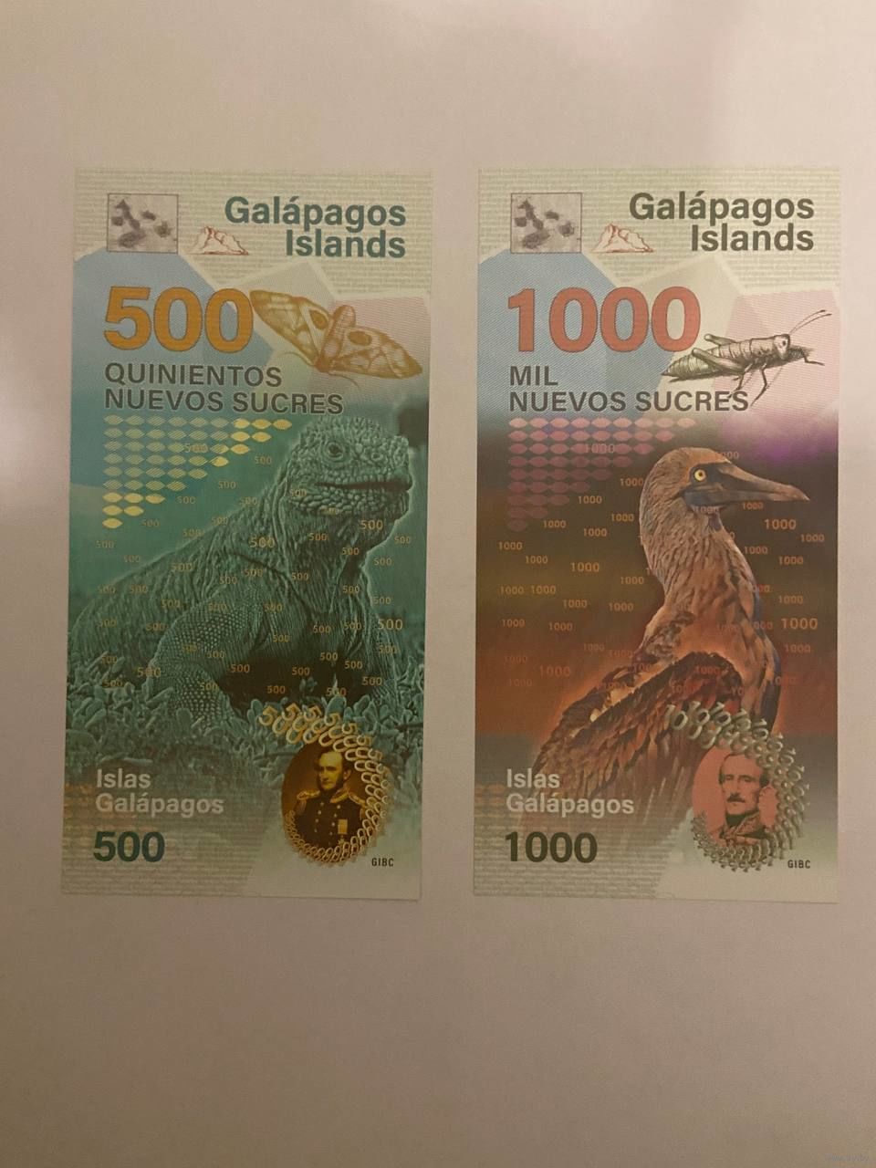Галапогосские острова принадлежат Эквадору. Неофициальная денежная единица Галапогосских островов – сукре. Эти банкноты Галапагосских островов выпущены специально для туристов и коллекционеров бон. На лицевой и оборотной сторонах банкнот изображены представители фауны островов – игуана, черепаха, пингвин, различные птицы. Эти "коллекционные" деньги выполнены из пластика.