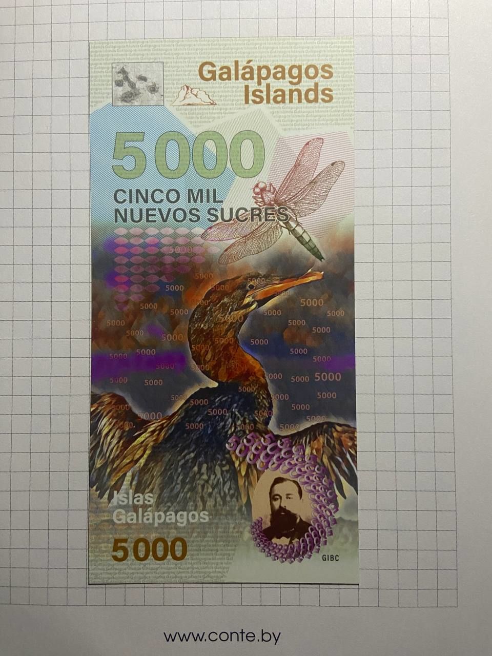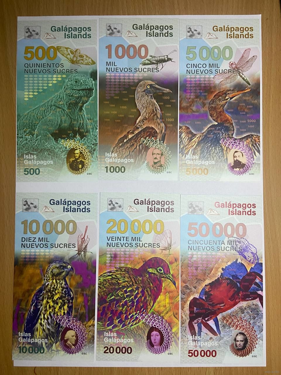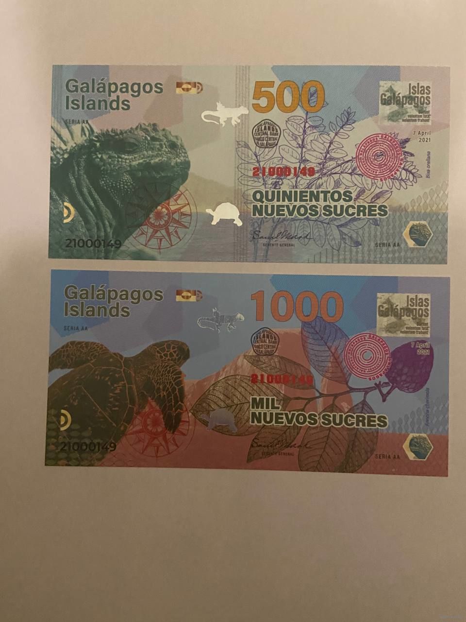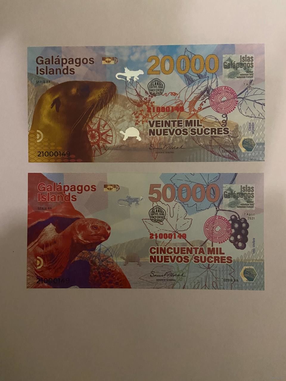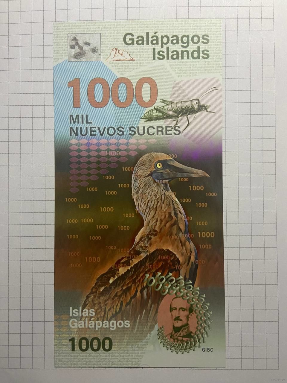 Галапогосские острова принадлежат Эквадору. Неофициальная денежная единица Галапогосских островов – сукре. Эти банкноты Галапагосских островов выпущены специально для туристов и коллекционеров бон. На лицевой и оборотной сторонах банкнот изображены представители фауны островов – игуана, черепаха, пингвин, различные птицы. Эти "коллекционные" деньги выполнены из пластика.