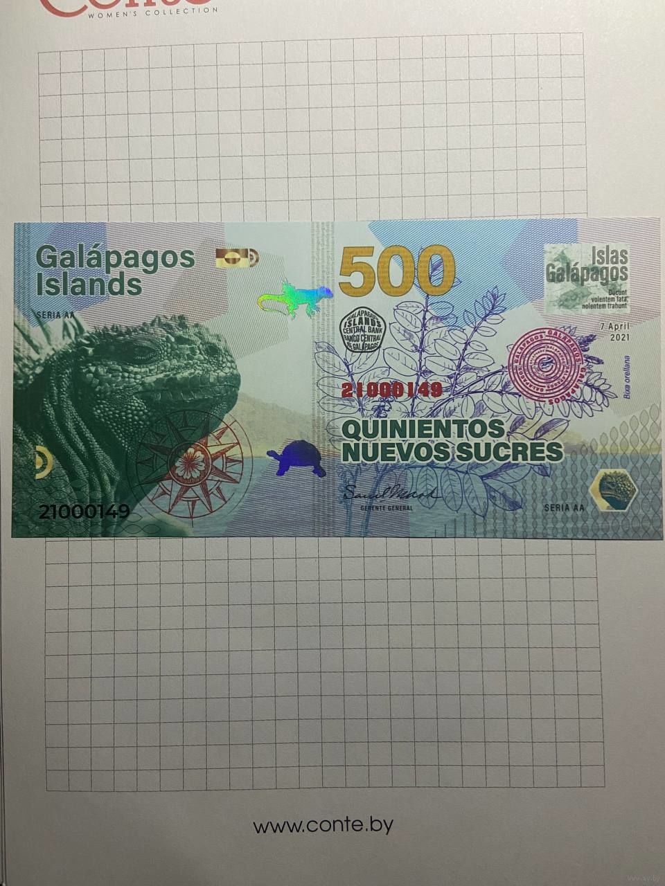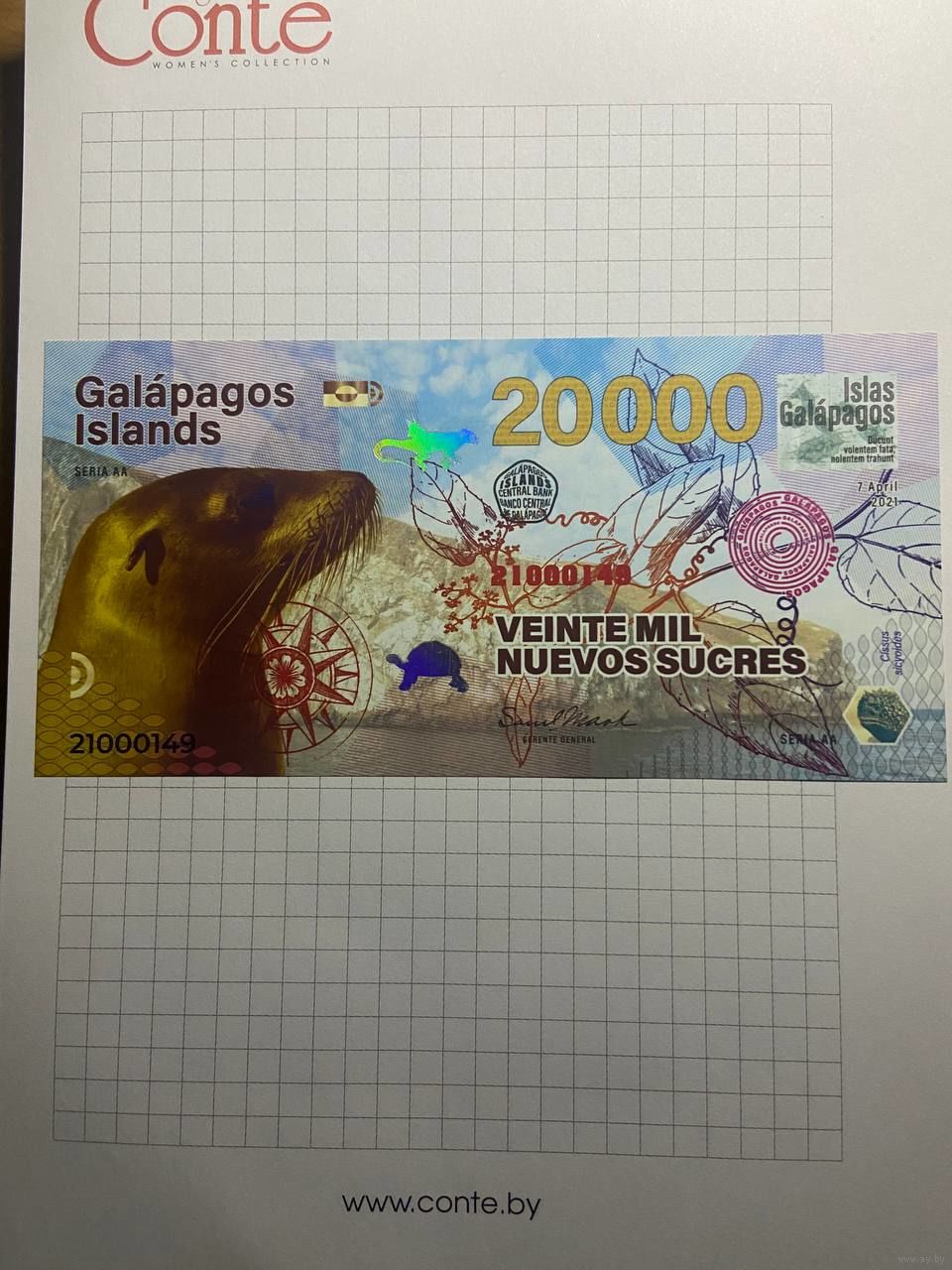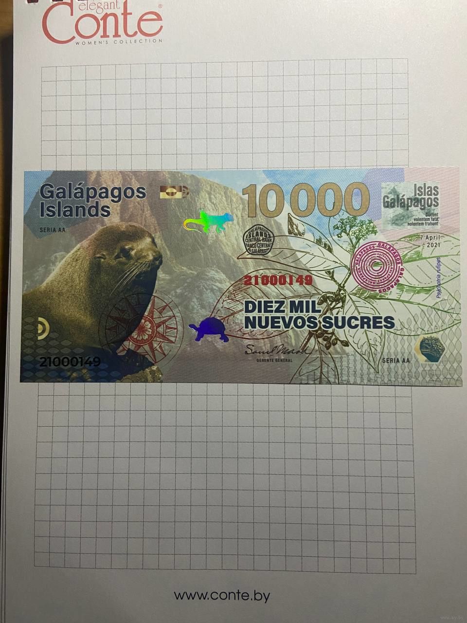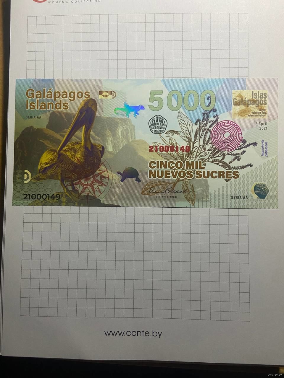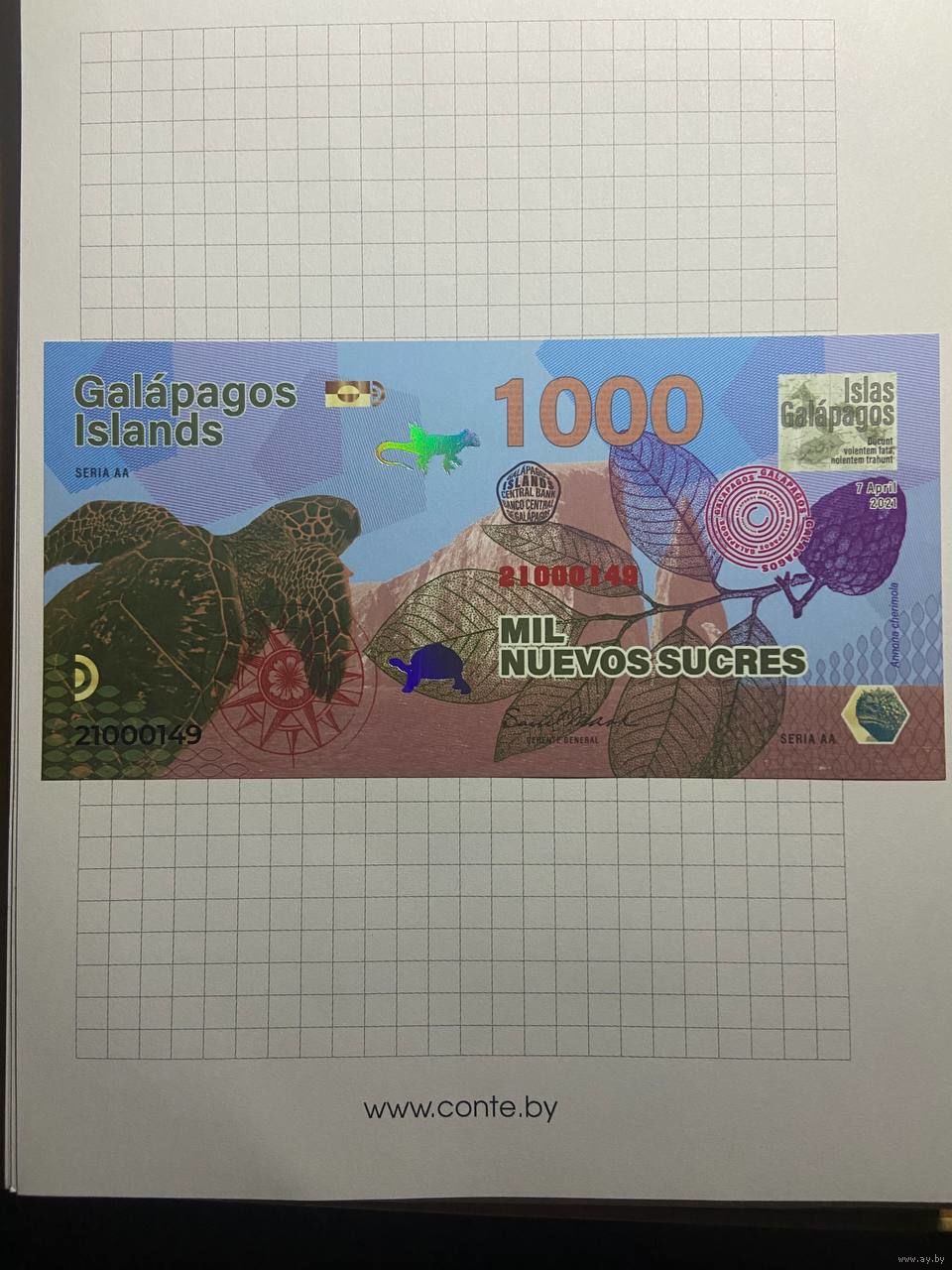 Галапогосские острова принадлежат Эквадору. Неофициальная денежная единица Галапогосских островов – сукре. Эти банкноты Галапагосских островов выпущены специально для туристов и коллекционеров бон. На лицевой и оборотной сторонах банкнот изображены представители фауны островов – игуана, черепаха, пингвин, различные птицы. Эти "коллекционные" деньги выполнены из пластика.