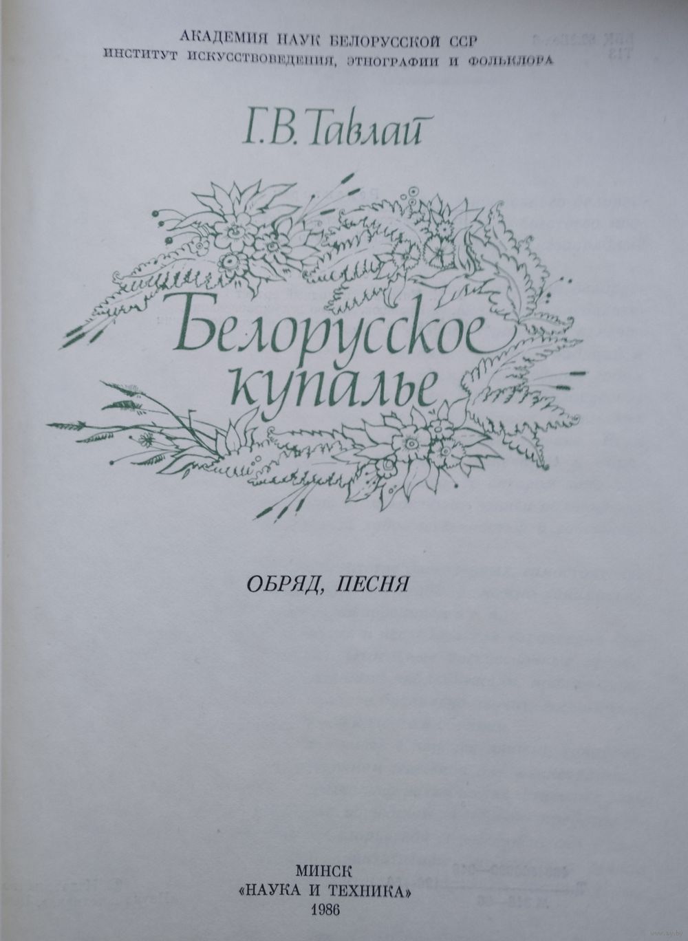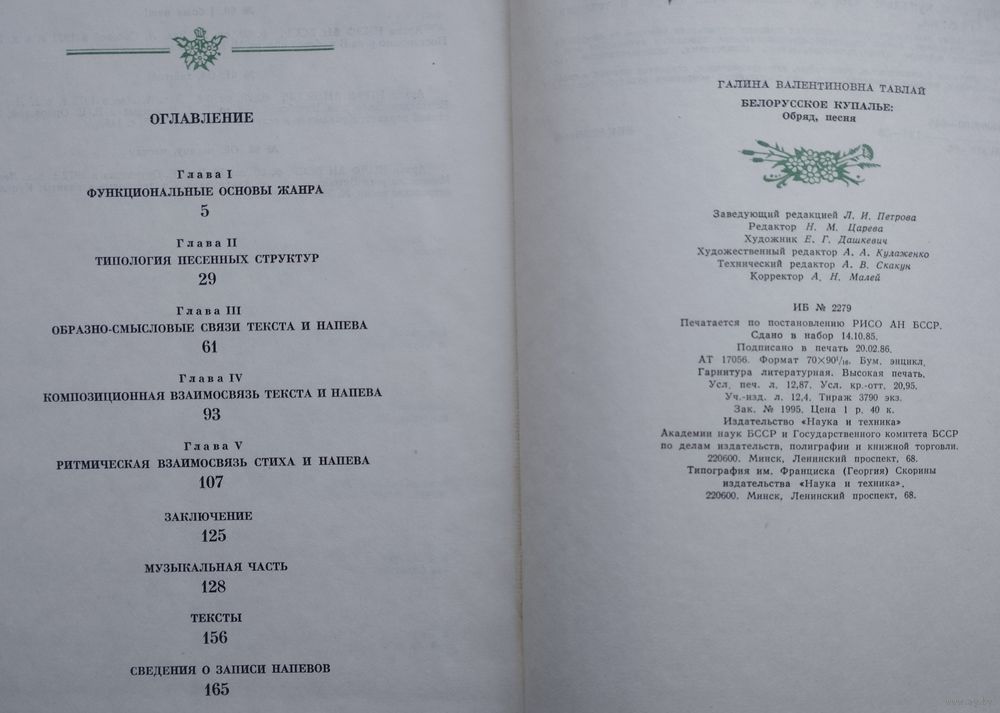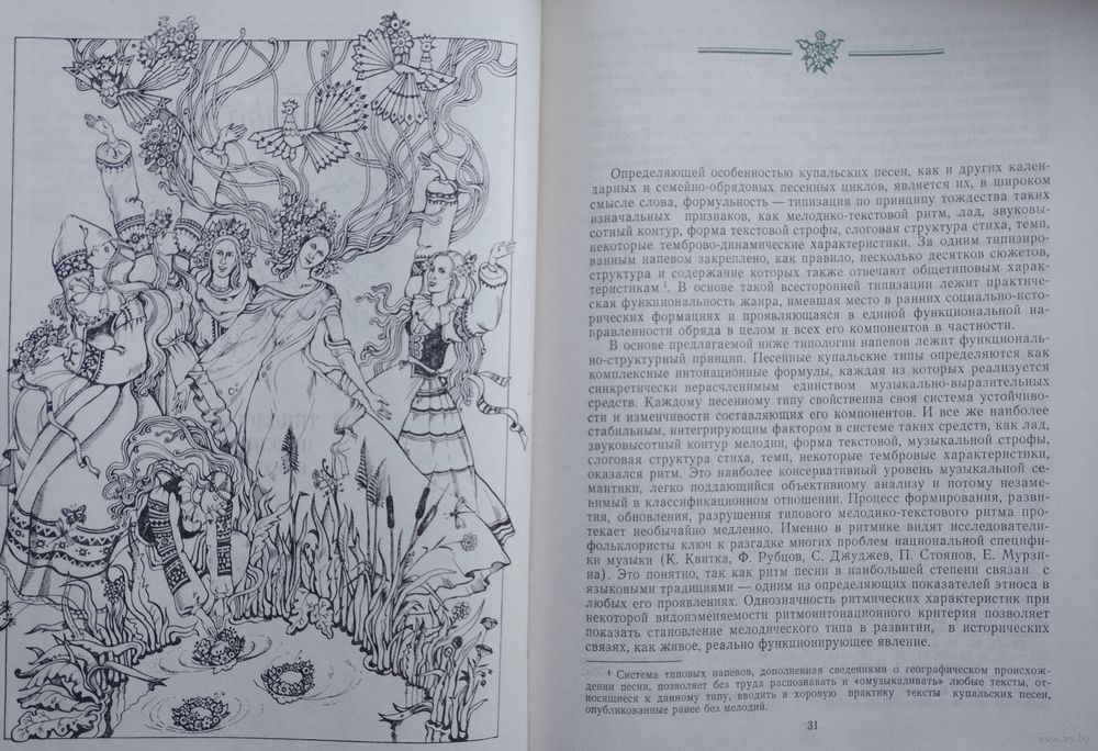 Большой формат. Тираж 3790 экз. 176 стр. Художник Е. Г. Дашкевич. В монографии освещается функциональная природа купальских обычаев (с опорой на современную традицию), дается структурно-функциональная типология купальских песен, рассматриваются вопросы музыкально-поэтического синкретизма, песенно-стиховые системы. Рассчитана на фольклористов, этнографов, этномузыковедов, студентов высших и средних музыкальных учебных заведений, всех, интересующихся вопросами культуры белорусского народа.