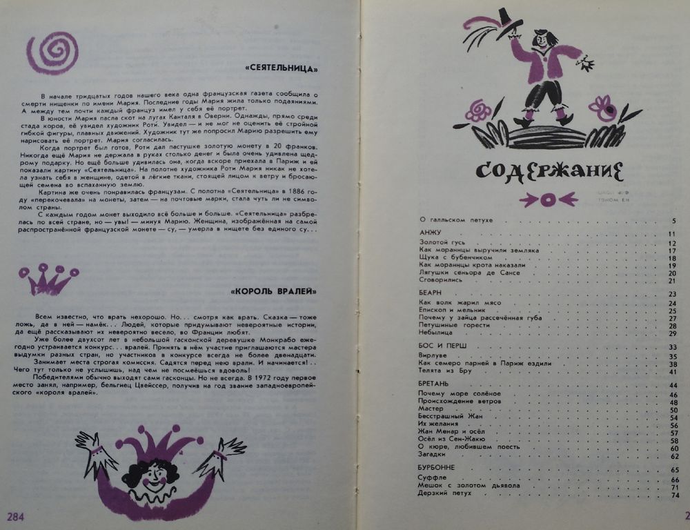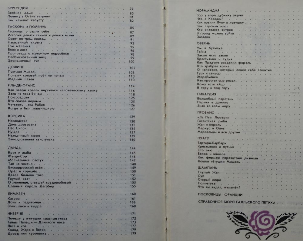 Большой энциклопедический формат. Ляссе. 288 стр. Иллюстрации Бориса Калаушина. В сборник французского фольклора вошли анекдоты, пословицы, стихи, легенды и сказки — волшебные, бытовые, о животных. Все эти забавные истории создавались каждая в своей исторической области Франции, отражая её особенности и характер местных жителей. Поэтому каждой области посвящён свой раздел с краткой исторической справкой. Рисунки Бориса Калаушина отражают задорное настроение книги, самоиронию французского народа и его любовь к хорошей шутке. Штамп личной библиотеки.