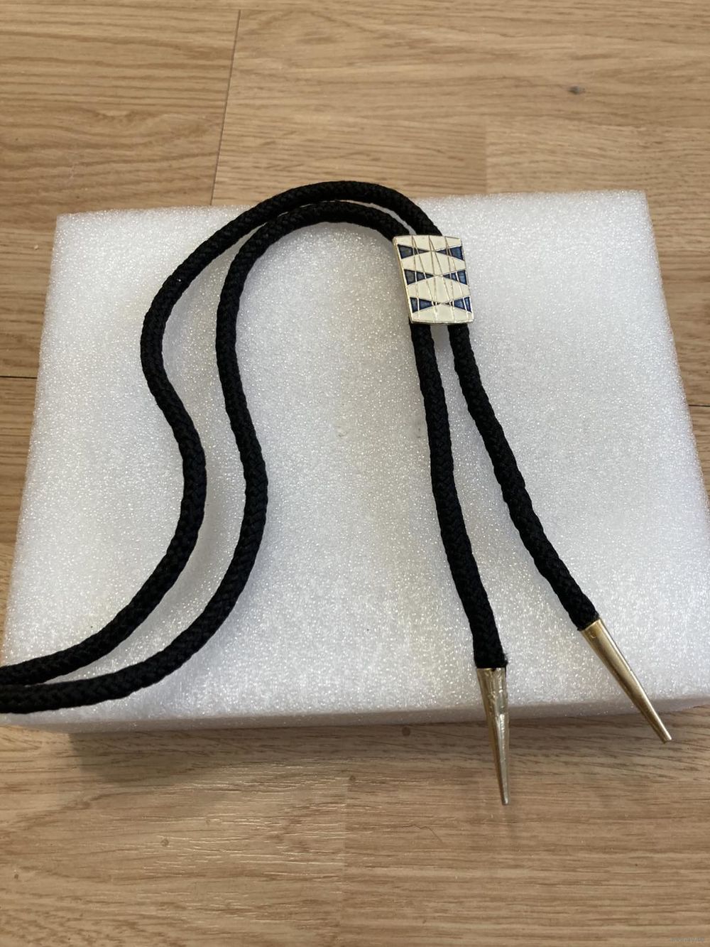 Галстук-боло — винтажный аксессуар, СССР, состоящий из шнурка с декоративным зажимом и металлическими наконечниками. Зажим выполнен в прямоугольной форме с геометрическим узором, напоминающим технику инкрустации или перегородчатой эмали. Синие треугольные вставки на светлом фоне создают контрастный орнамент.