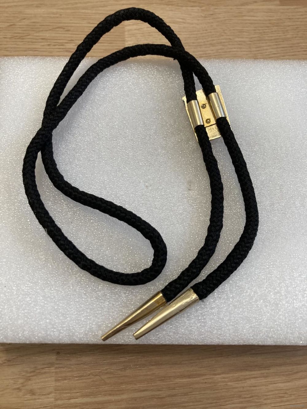 Материалы: Шнурок изготовлен из черного плетеного материала. Наконечники (аглеты) и сам зажим имеют золотистый металлический блеск. Подобные аксессуары часто ассоциируются с культурой ковбоев США, индейскими племенами (например, Зуни) или винтажной модой 1960-х. Есть клеймо на зажиме: ШЭ3, что говорит , вероятно год изделия 1963.