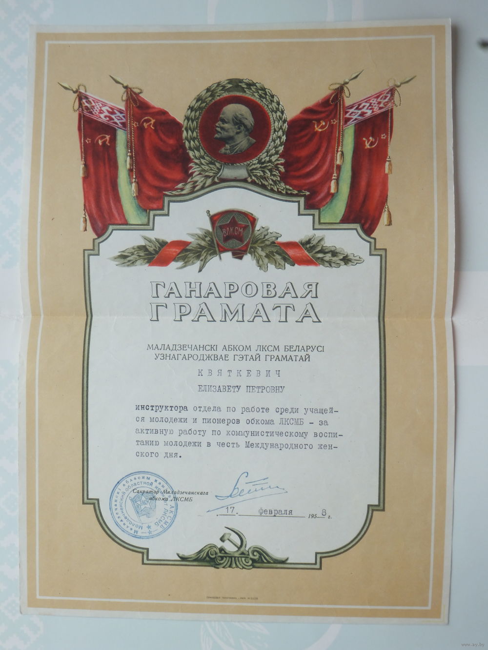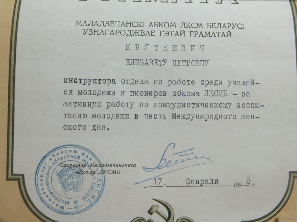 Ганаровая грамата Маладзечна 1958
