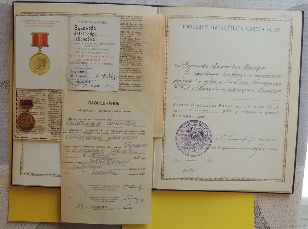 Ганаровая грамата Вярхоўнага Савета БССР, подпись Притыцкого, с документами и почетным знаком "Грамата ВС", 1968 г.
