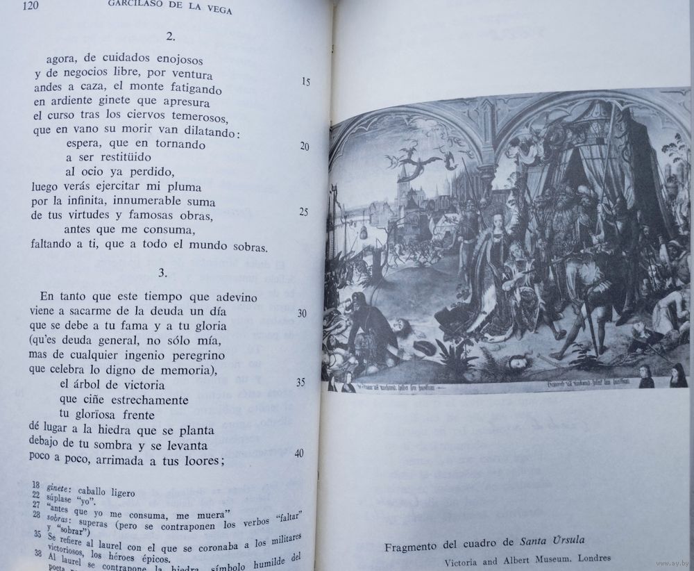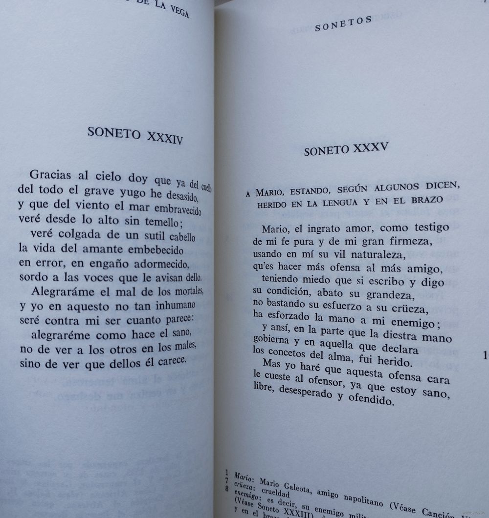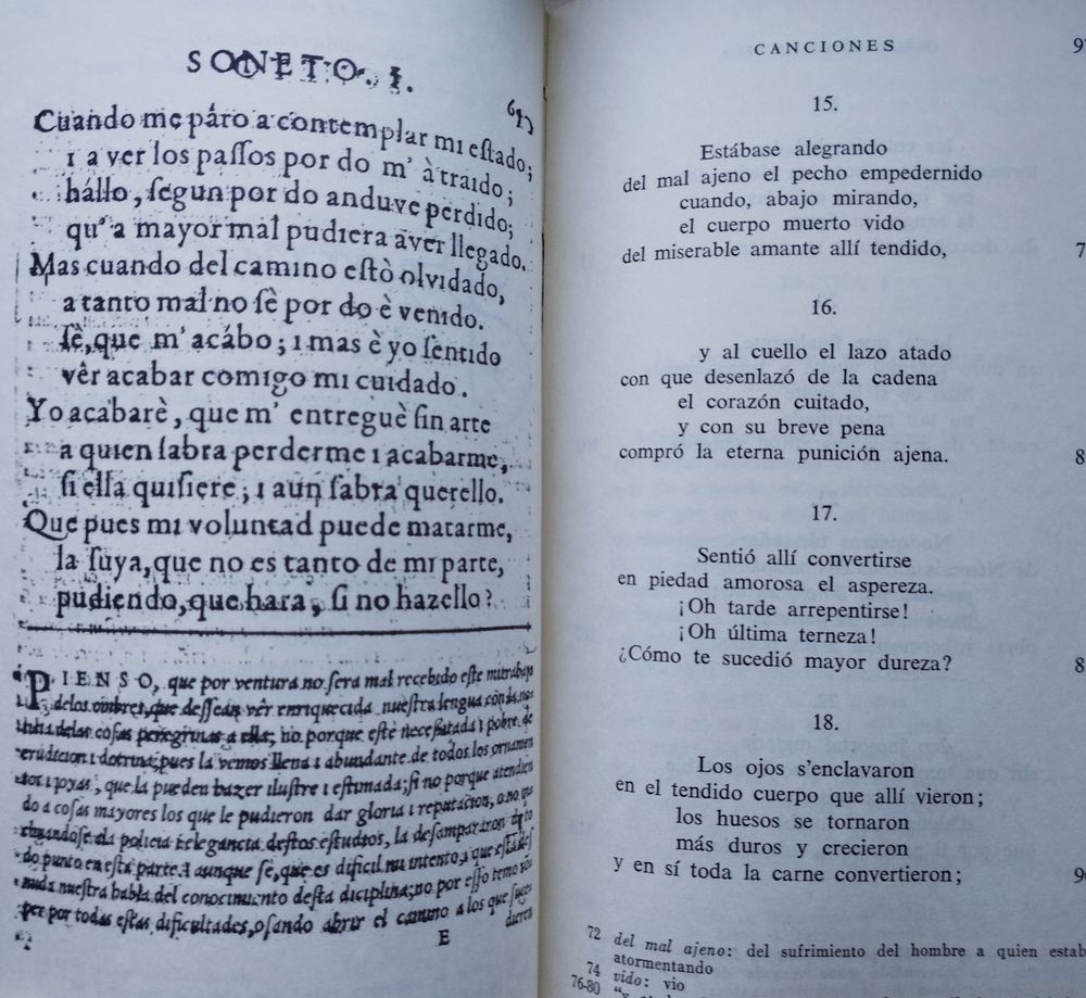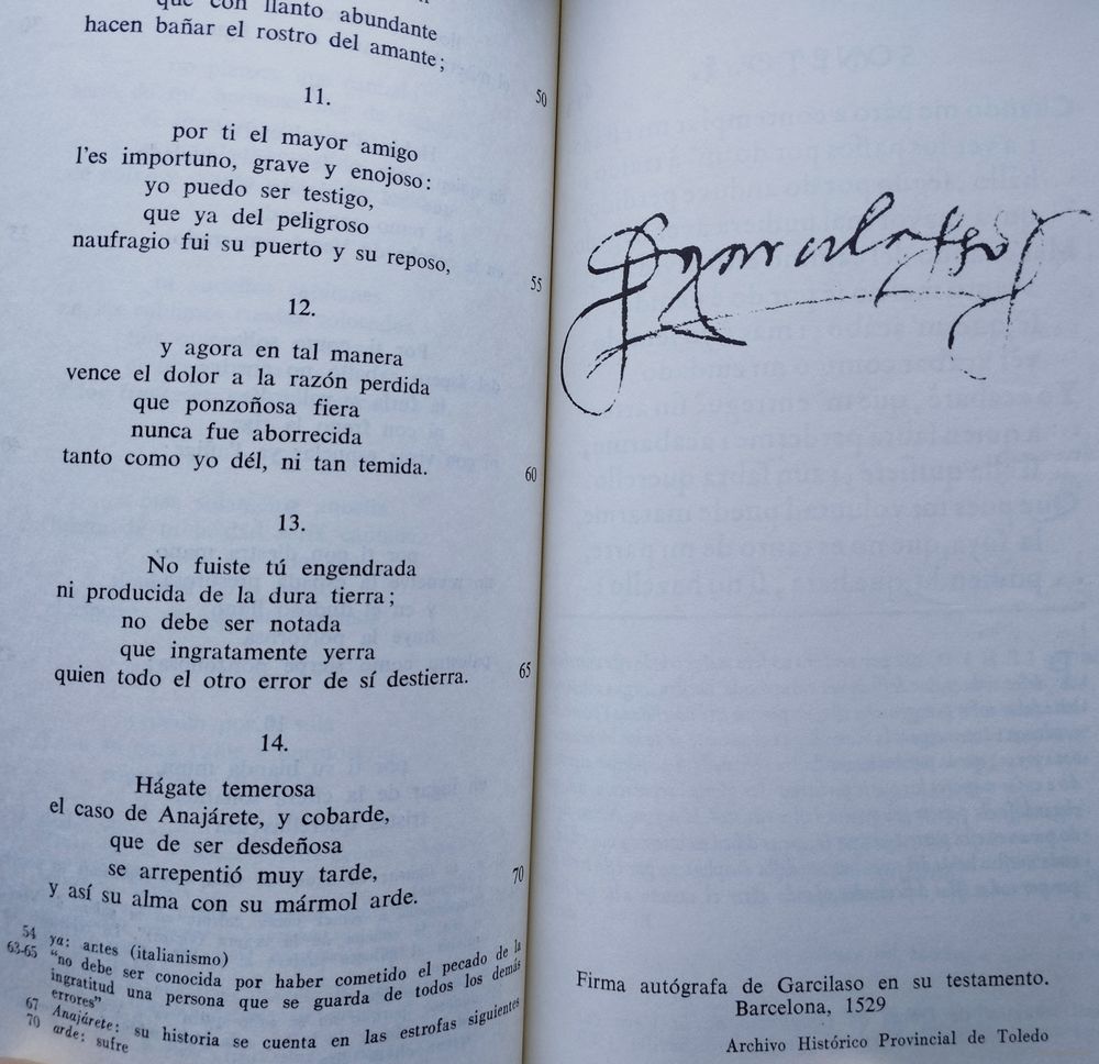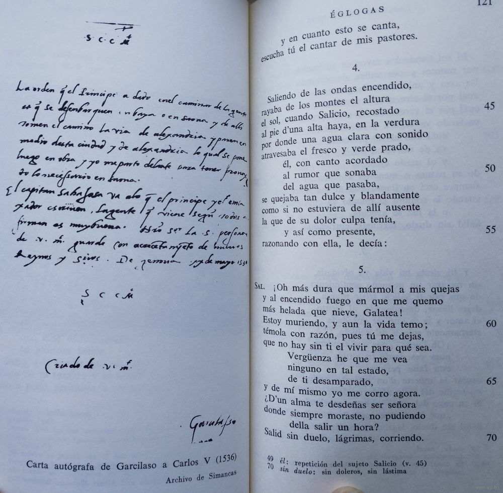 За свою недолгую придворную и военную карьеру Гарсиласо не опубликовал ни одного стихотворения. После его смерти в возрасте 35 лет его литературным душеприказчиком стал его друг и поэт-соратник Хуан Боскан. Боскан собрал все рукописи Гарсиласо, которые смог найти, и, публикуя свои собственные стихи, включил рукописи Гарсиласо в качестве приложения; том под названием «Las obras de Boscán y algunas de Garcilaso de la Vega» был издан в Барселоне в 1543 году, почти через семь лет после смерти поэта. Публикация этого тома стала культурным событием огромной важности, поскольку ознаменовала признание влияния итальянской поэзии эпохи Возрождения в Испании. Первая часть стихов Боскана состояла из песен в коротких стихах, в основном восьмисложных, в старом стиле XV века; но остальная часть тома содержала односложные стихи нового стиля. В первую очередь, использовались следующие строфические формы: сонет; итальянская песня, состоящая из строф смешанного состава из одиннадцати и семи слогов; терцина; октава; внутренняя рифма; и нерифмованный стих. Эти тонкие метрические нововведения открыли испанскому читателю поэтический мир классических и мифологических пейзажей, повествований и дискурсивных аргументов, игнорируемых в раннем испанском стихосложении, где доминировали более частая и четкая рифма, короткие фразы и абстрактные, концептуальные образы.