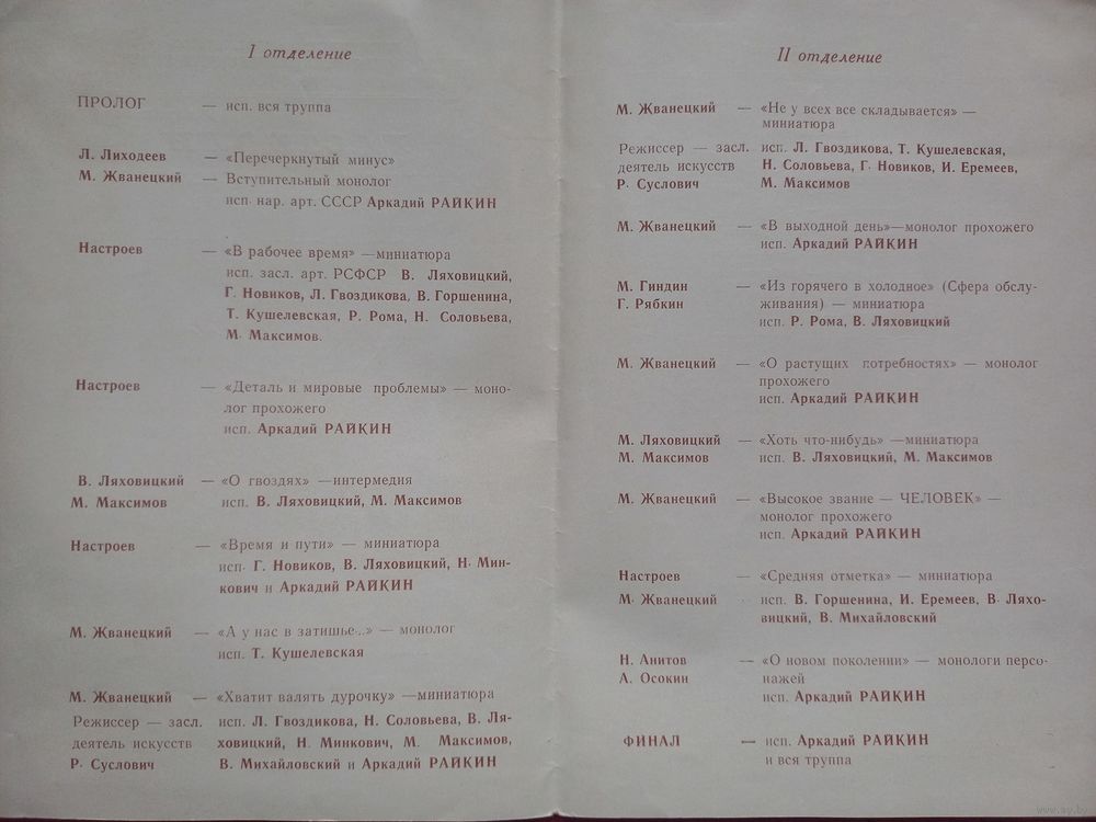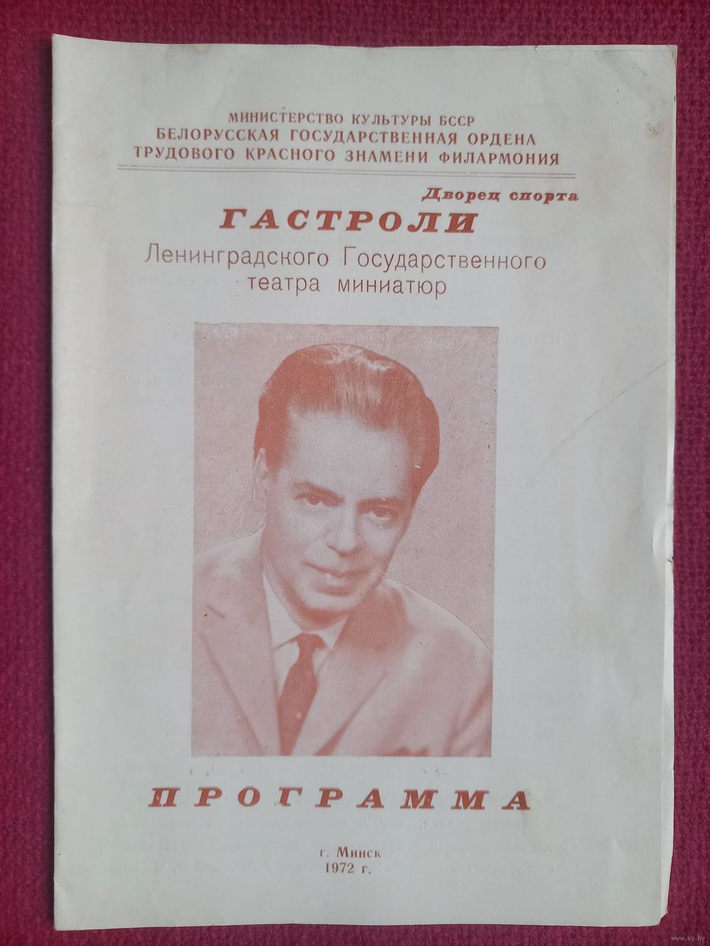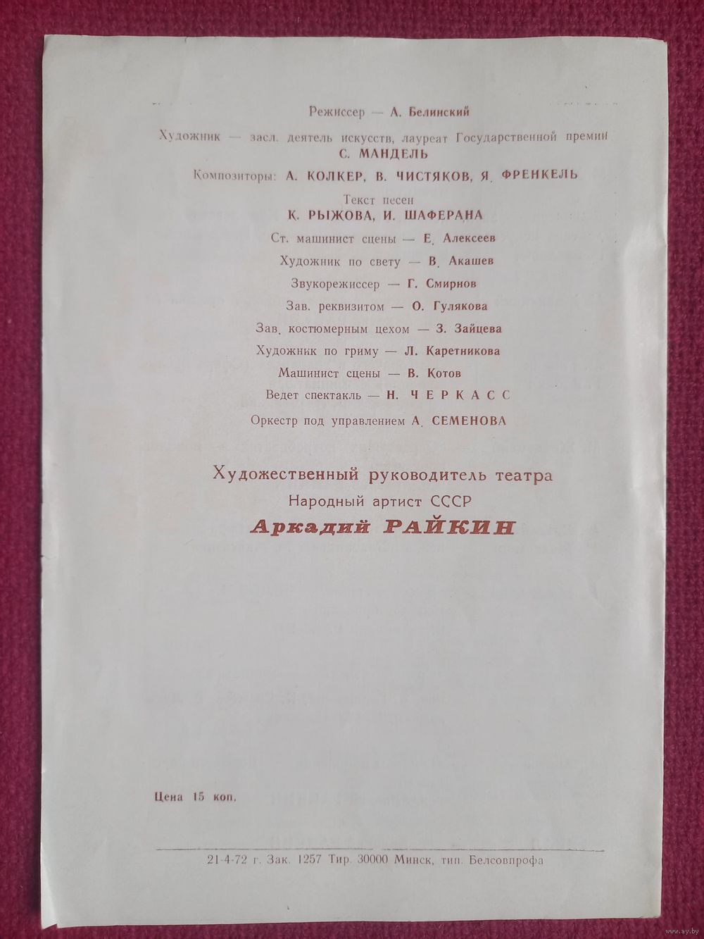 Гастроли в Минске. Программа спектакля Ленинградского театра миниатюр (Аркадий Райкин). 1972 г.