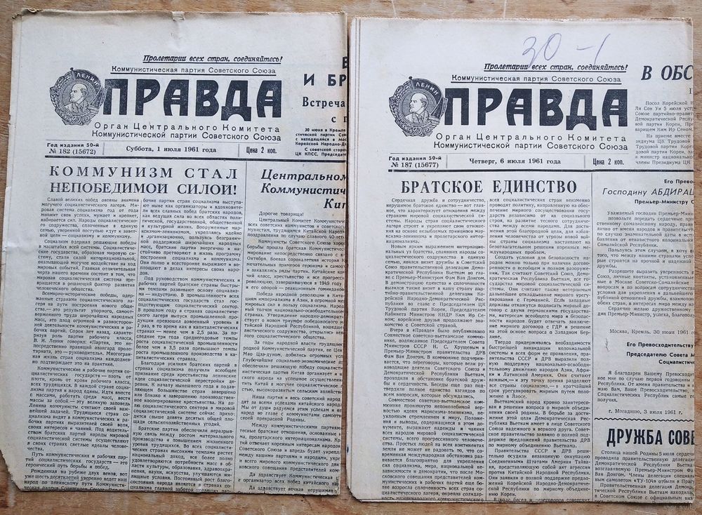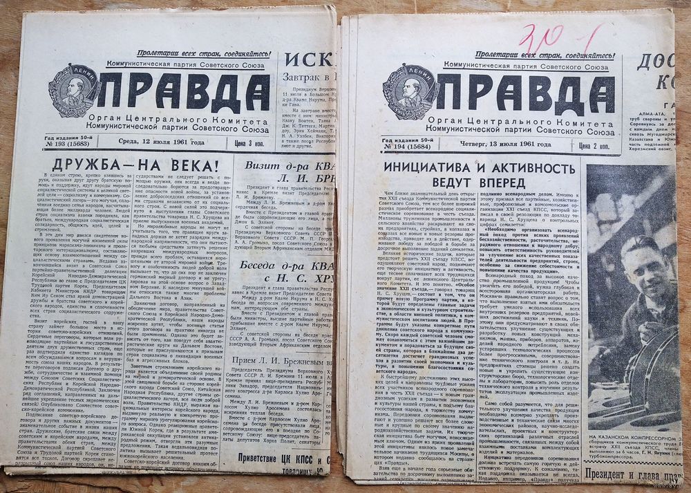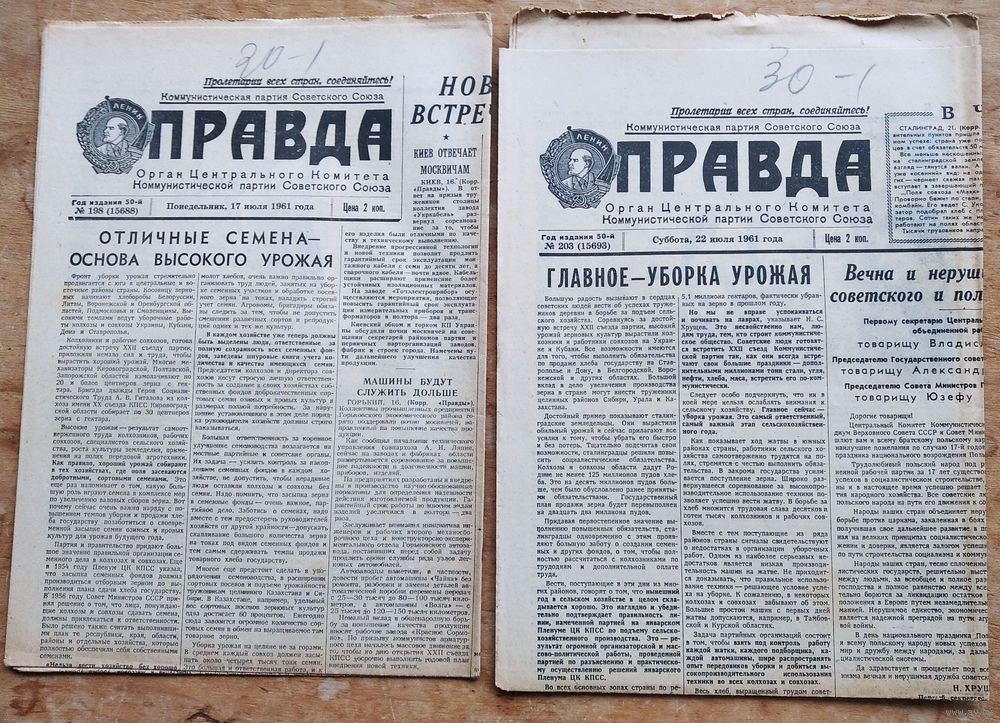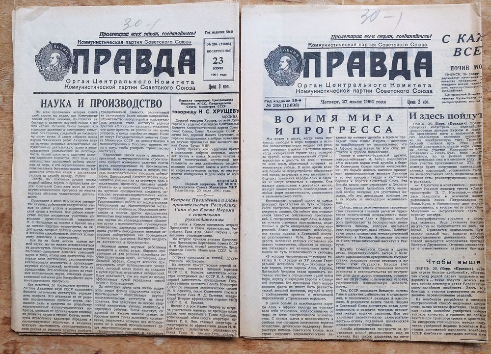 Газета Правда. 1, 6, 12, 13, 17,22, 21, 27, 31 Июля 1961 г 9 номеров. Цена за 1.