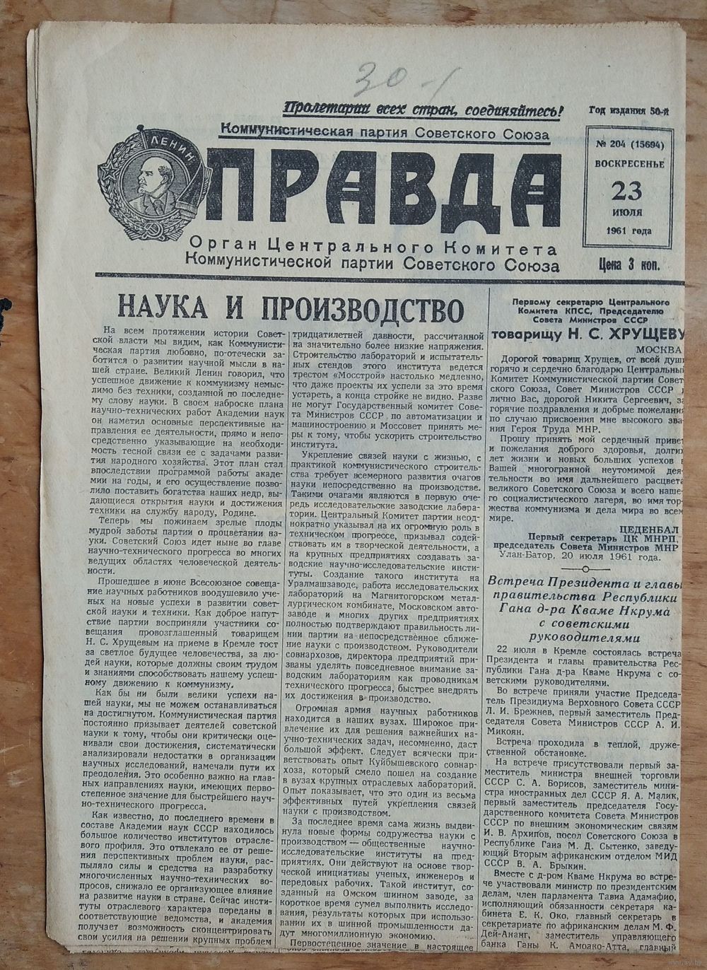 Газета Правда. 23 июля. 1961 г. Фото Хрущева Н.С.