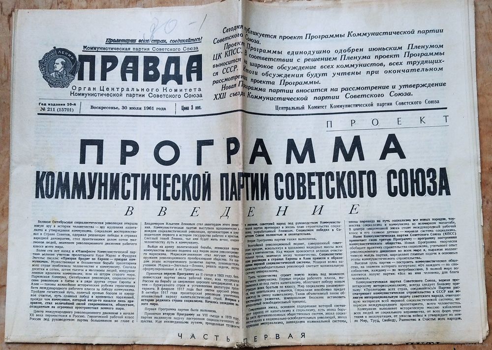 Газета Правда. 30 июля 1961 г. Проект Программы КПСС.